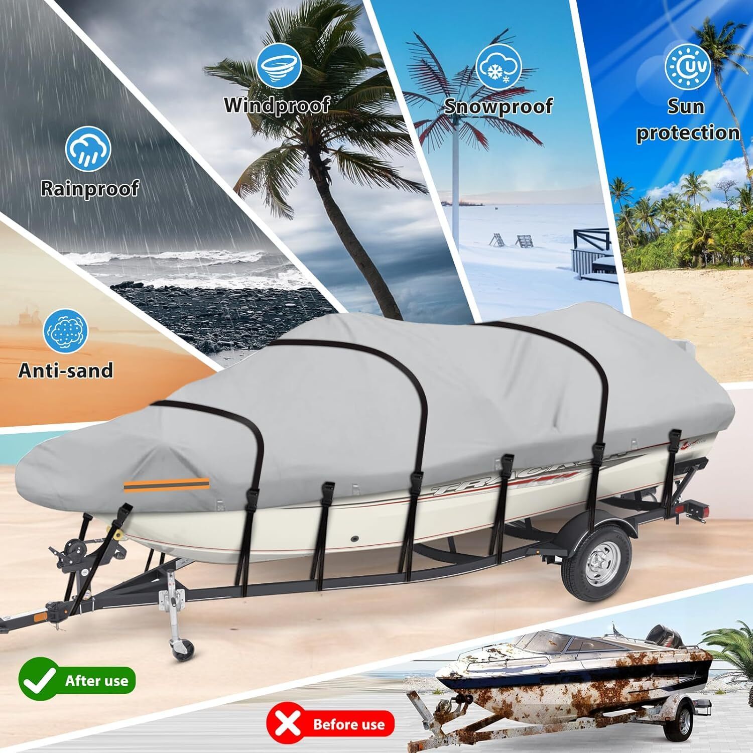 Boat tarp Equipped with Adjustable and Detachable Thick High-Density Straps and thickened 2cm quick-release windproof buckles which allow you to lock the cover with your boat and prevent it from being blown away,