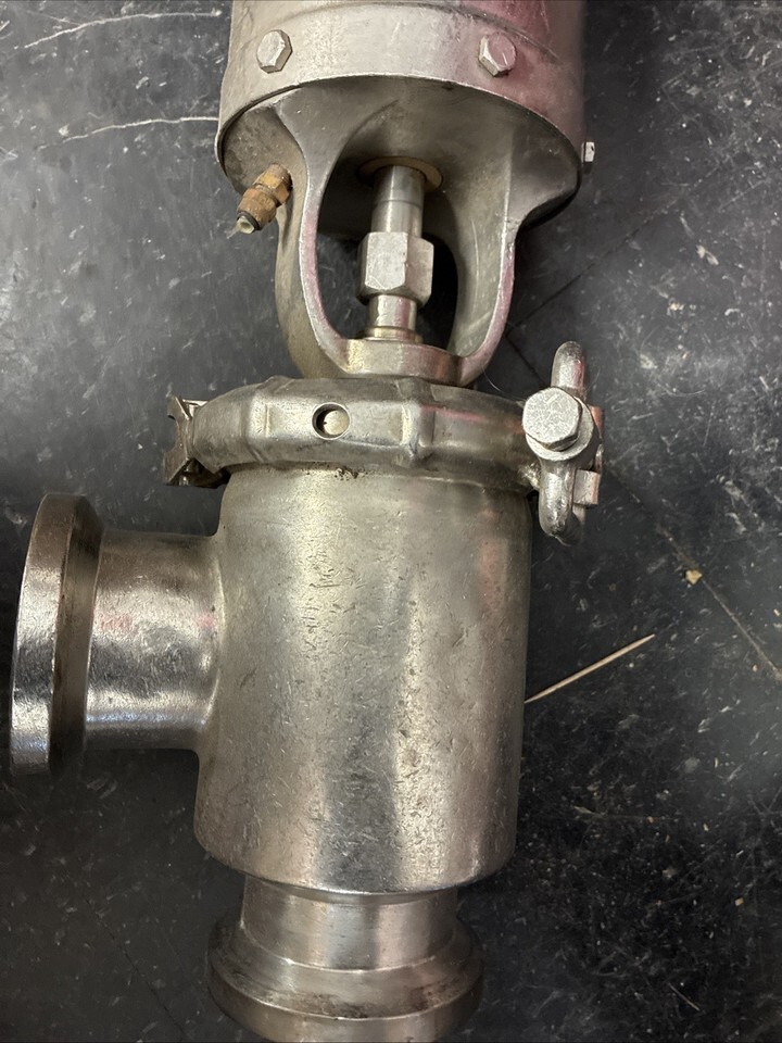 The image shows an air-actuated sanitary stainless steel valve, also known as a hygienic or sanitary valve. These types of valves are specifically designed for applications that require high levels of cleanliness and hygiene, such as in the food, dairy, beverage, and pharmaceutical industries. 4? We also have a few.