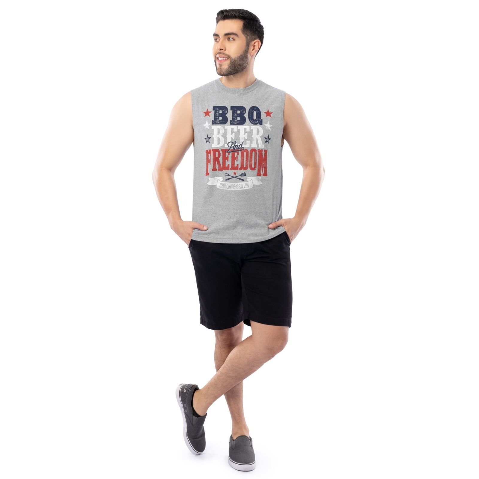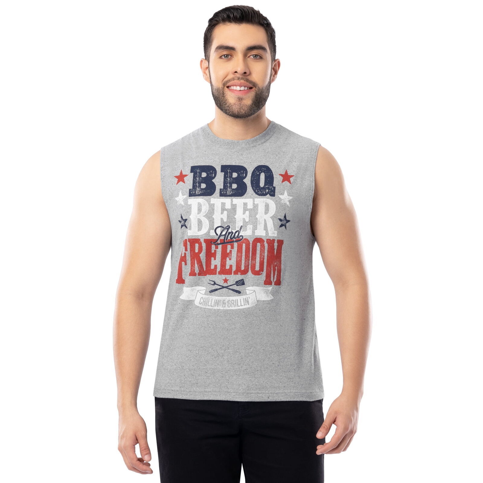 Make Way to Celebrate?s Americana Graphic Muscle Tank a staple in your warm-weather wardrobe. Whether you're flipping burgers on the grill or soaking up the sun at the beach, this soft sleeveless tank ensures cool comfort. Display your American pride throughout the season from Memorial Day to the 4th of July and beyond with the distinctive Americana-themed graphics. Available in sizes S-3XL with a variety of designs, these sustainable muscle tanks are crafted from a recycled cotton/polyester blend, which makes them an environmentally-conscious choice.
