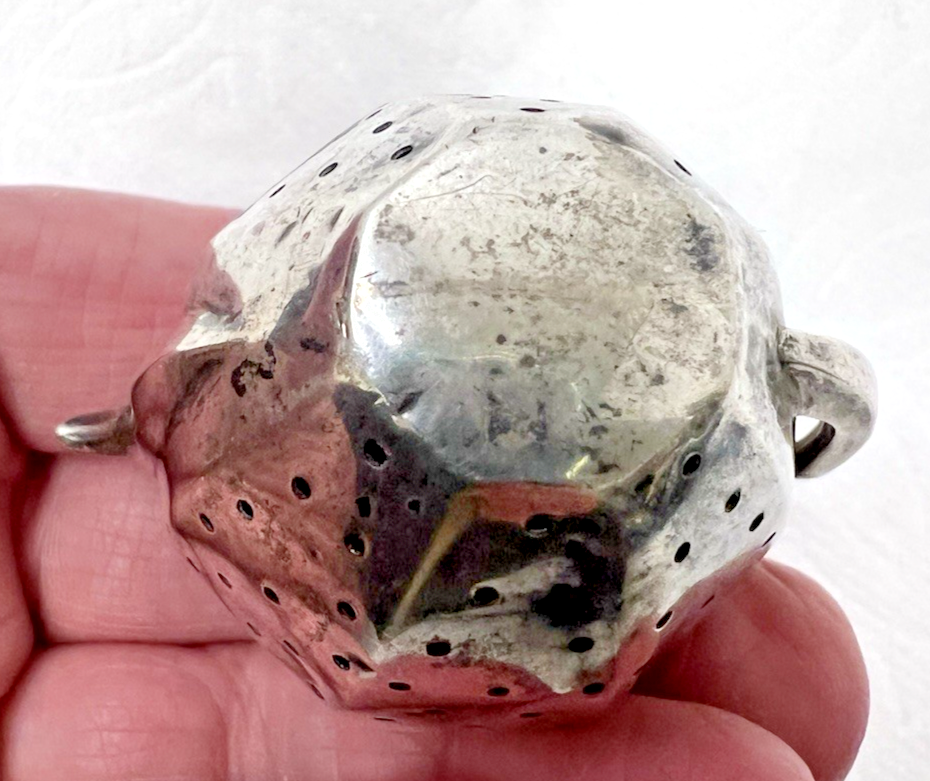 Webster Company Sterling Silver Teapot Shaped Loose Leaf Tea Ball w Finger Ring It has a few tiny dents but overall, it's just sweet! 2 inches tall x about 1 1/8 inch