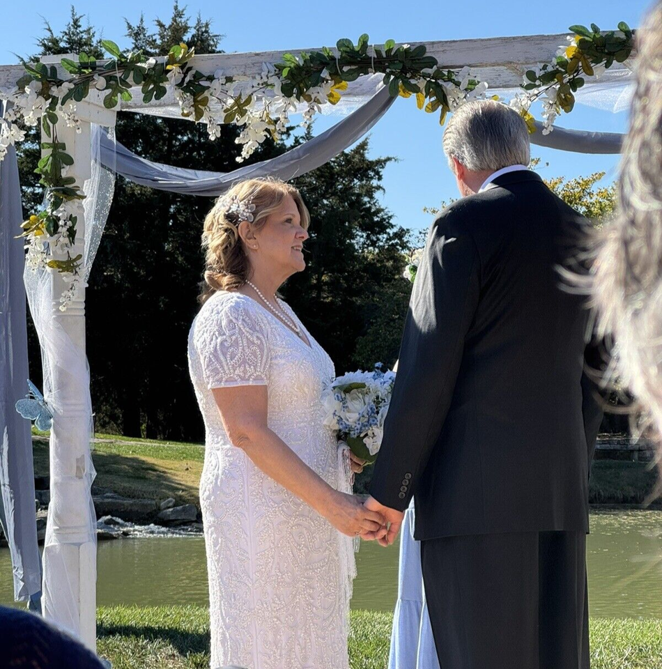 Drapes Arbor Drapery Wedding with Off White netting and 9c off white rose flowers to hang over the arbor, (I used white zip ties) Ceremony Reception Swag Decorations. It's only used once.