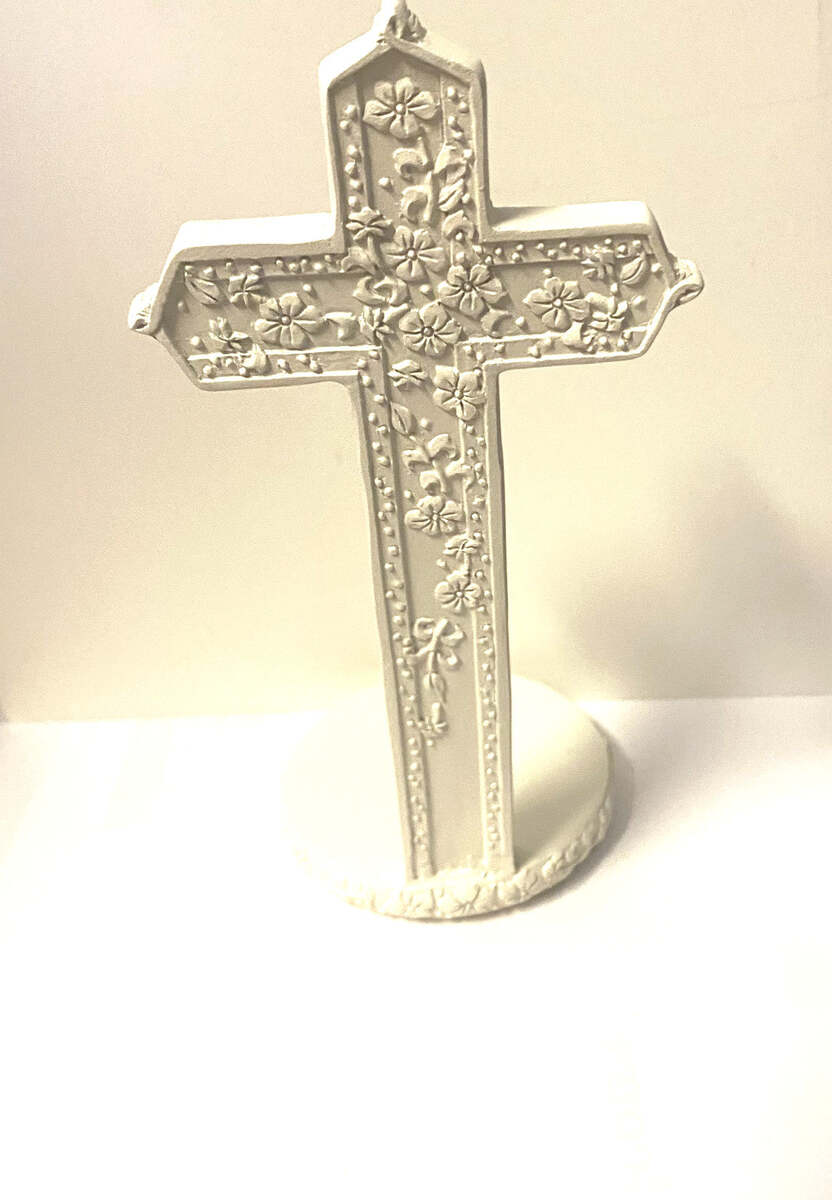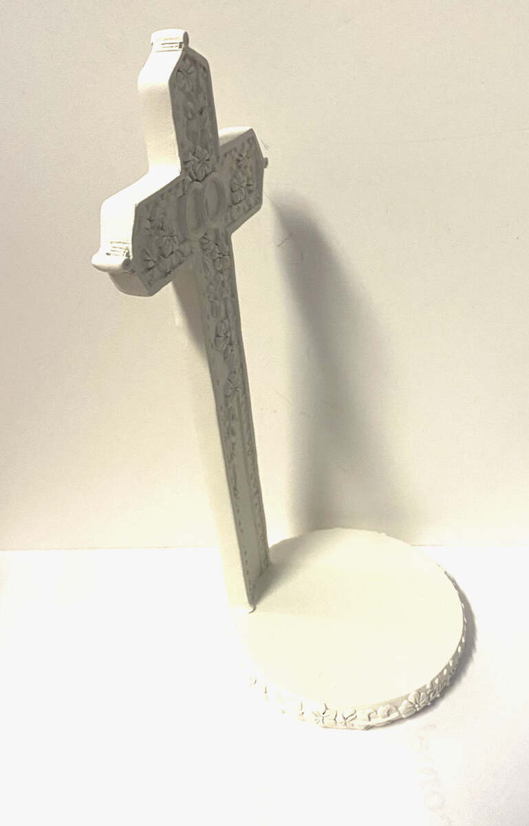 This measures: 7" x 3.50" diam. made of resin/stone. There's an inscription on the cross base, but it's hard to read. it says " Faith, Hope and Love Abide".