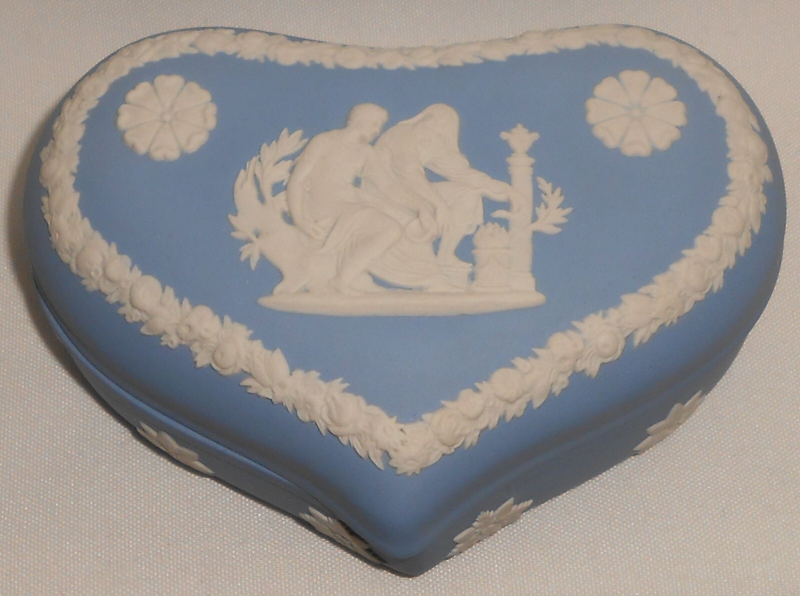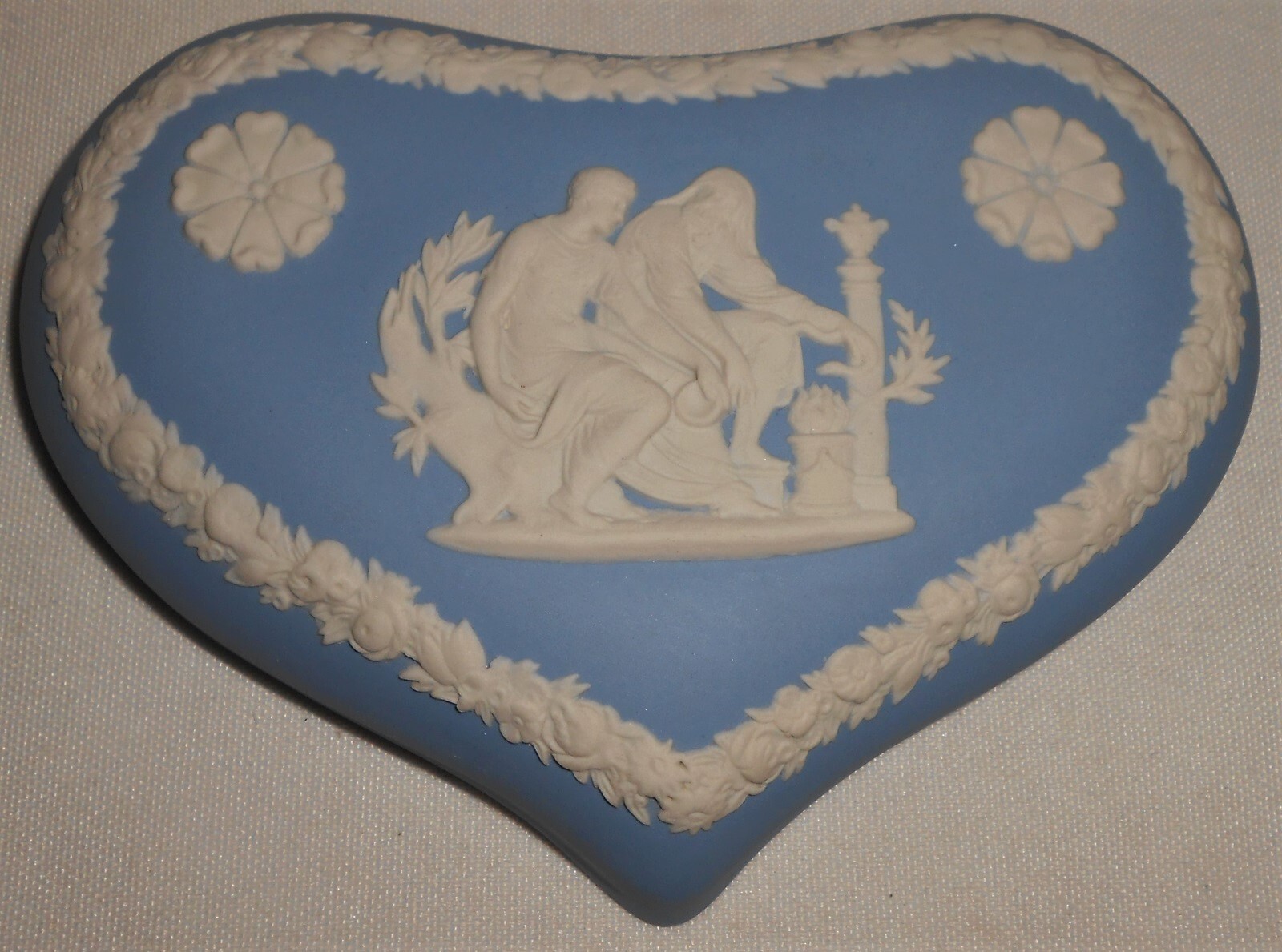 This is the Jasperware Blue and White Heart Shaped Trinket Box from Wedgwood that measures approx 5" x 4" and approx 1 3/4" tall. It is in good pre-owned condition with no chips or damage.