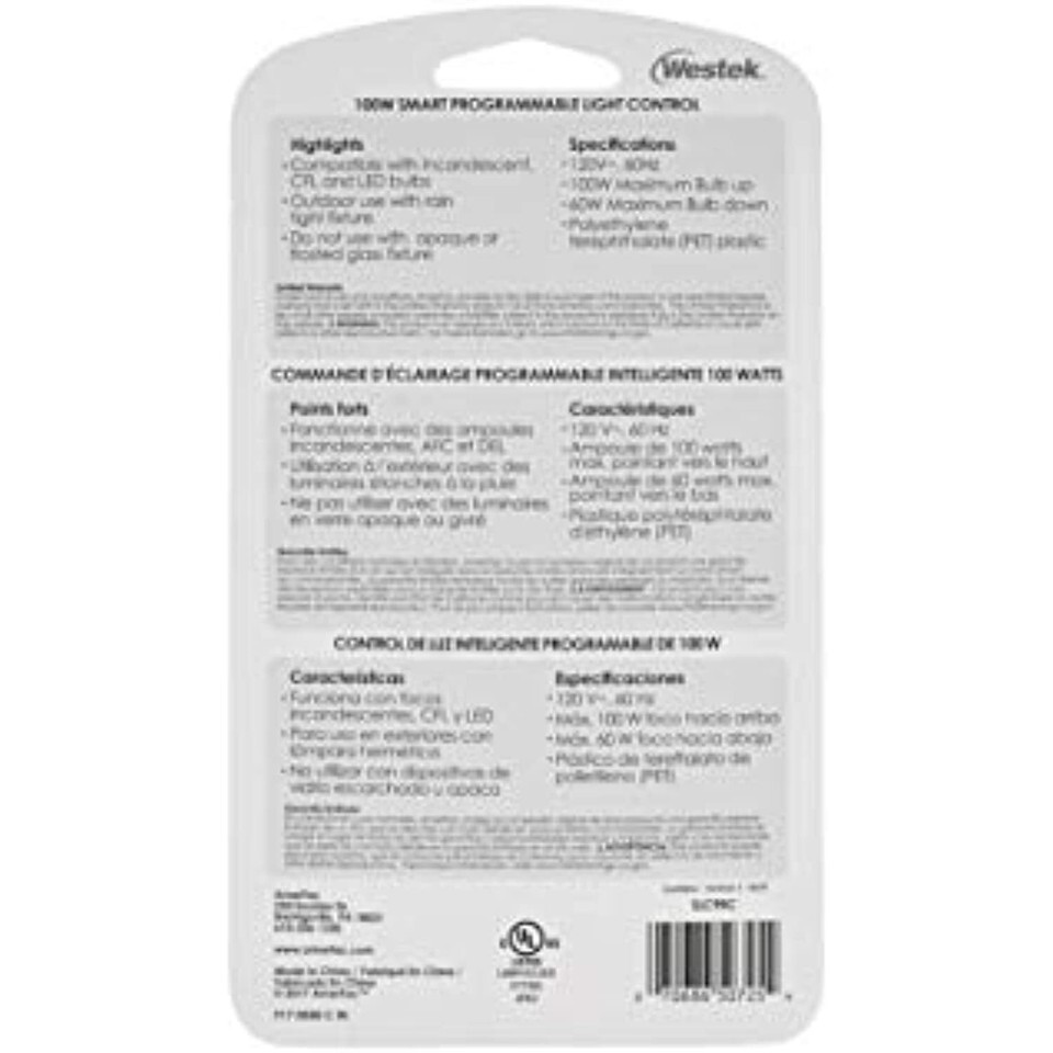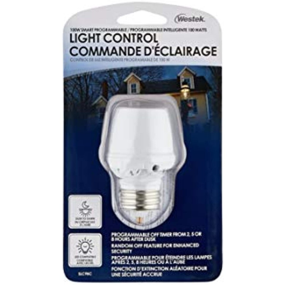 Product Description The Westek SLC9BC Programmable Light Control is perfect in laundry rooms, garages, basements, attics or any area indoors or outdoors where you need light. This device converts any light socket into a programmable night light that automatically turns on in low light conditions, adding safety and security to any space. The light will turn off at a selectable time of 1, 2, 5 or 8 hours or can be set to turn off at random times to discourage intruders. Integrated micro-processor ensures more accurate off-time. Easy installation; screw the sensor into any existing light socket, then install a bulb up to 100w into the control. Compatible with LED, incandescent, and CFL bulbs. AmerTac manufacturing brands offer complete lines of distinctive decorative home accent products that include trend-setting wall plates, money saving LED night lights, innovative under cabinet lighting and LED battery operated lights. More functional product lines include energy-saving timers, dimmers and lighting controls, as well as an extensive offering of consumer electronics accessories for the home and office. AmerTac's products are distributed to leading home centers, lighting showrooms, mass merchandisers and supermarket chains throughout North America. From the Manufacturer Due to continuing product development, the product you receive may look slightly different than the one displayed.