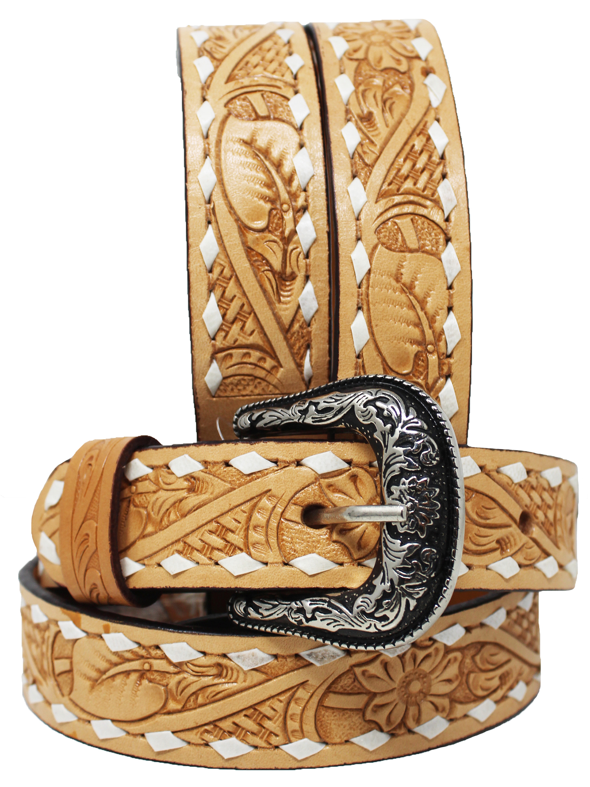 Challenger full-grain leather kids belt comes beautifully accented with a hand-tooled antique floral design. The turquoise buckstitch edges completes the western look. Belt features a removable silver engraved buckle. Comes in 1-1/4" width.