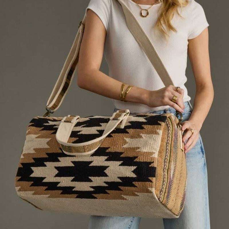 - Western Aztec Cotton Duffel Travel Bag Cream Black Tan