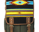 Challenger western bag made from supple genuine distressed full-grain leather and hunter green canvas. Bag comes accented with a unique handwoven saddle rug multiclor pattern. This lightweight versatile bag is ideal for work, traveling, weekend trips, daypacking, or the great outdoors. Conveniently sized roomy multi-pocket bag allows for great organization, and fits most airline overhead bins for a carry-on option. Includes adjustable padded for comfort shoulder straps. Top full zipper closure main pocket comes fully lined. Inside has one side zippered pocket, and two open compartments for organized storage. The outside of the backpack has two zippered pockets, two open pockets, and dual side pockets for bottles or other travel gear. The antique finish brass hardware beautifully ties the bag together.? Bag measures 12" L x 18" H.