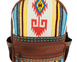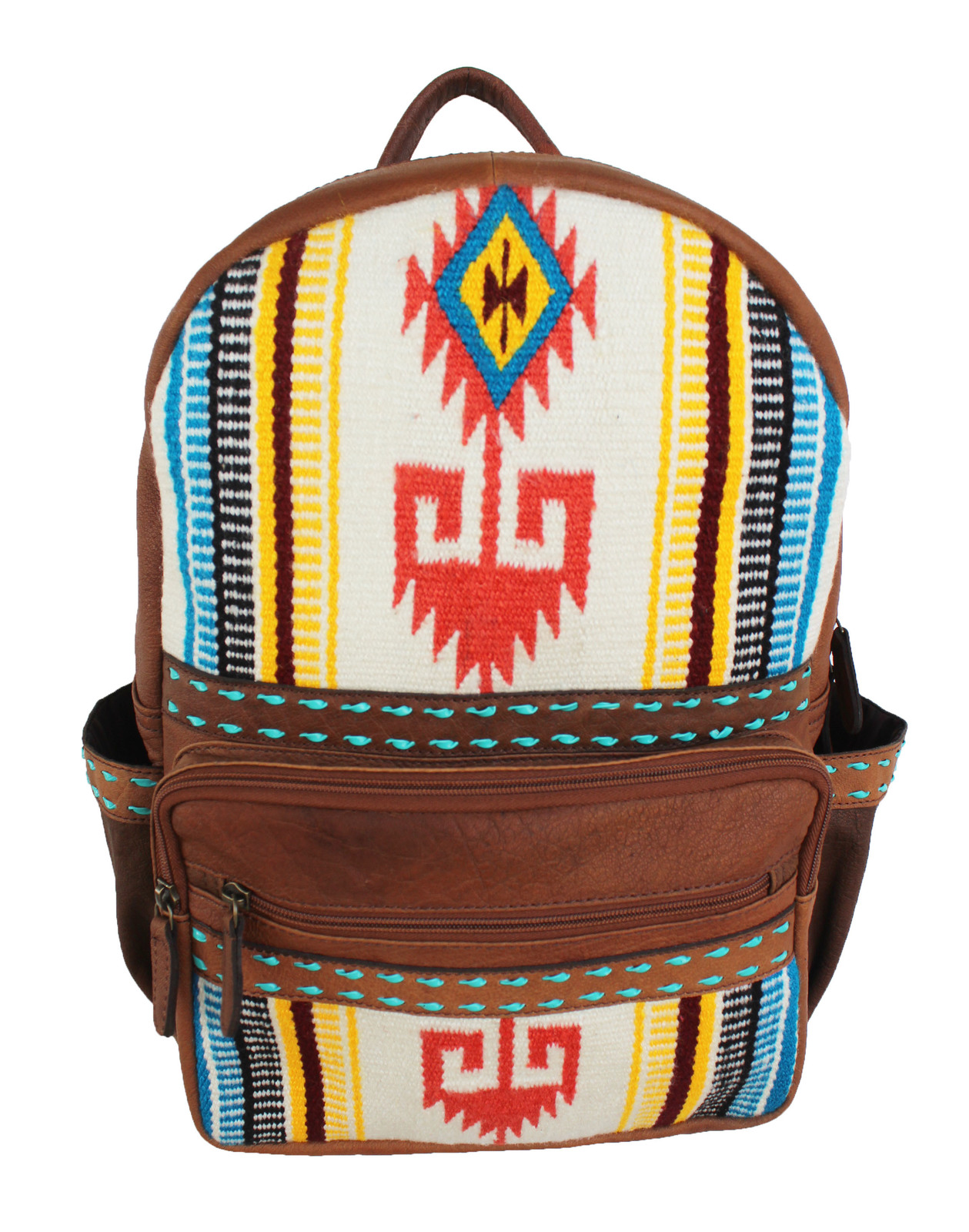 Challenger western bag made from supple genuine full-grain leather to endure everyday use. Bag comes accented with a unique handwoven saddle rug multiclor pattern, and turquoise buckstitch. This lightweight versatile bag is ideal for school, work, traveling, weekend trips, daypacking, or the great outdoors. Conveniently sized roomy multi-pocket bag allows for great organization, and fits most airline overhead bins for a carry-on option. Includes adjustable padded for comfort shoulder straps. Top full zipper closure main pocket comes fully lined. Inside has one side zippered pocket, two open compartments, and one padded laptop pocket for organized storage. The outside of the backpack has two front zippered pockets, and dual side pockets for bottle or other travel gear. The antique finish brass hardware beautifully ties the bag together.? Bag measures 12" L x 17" H.