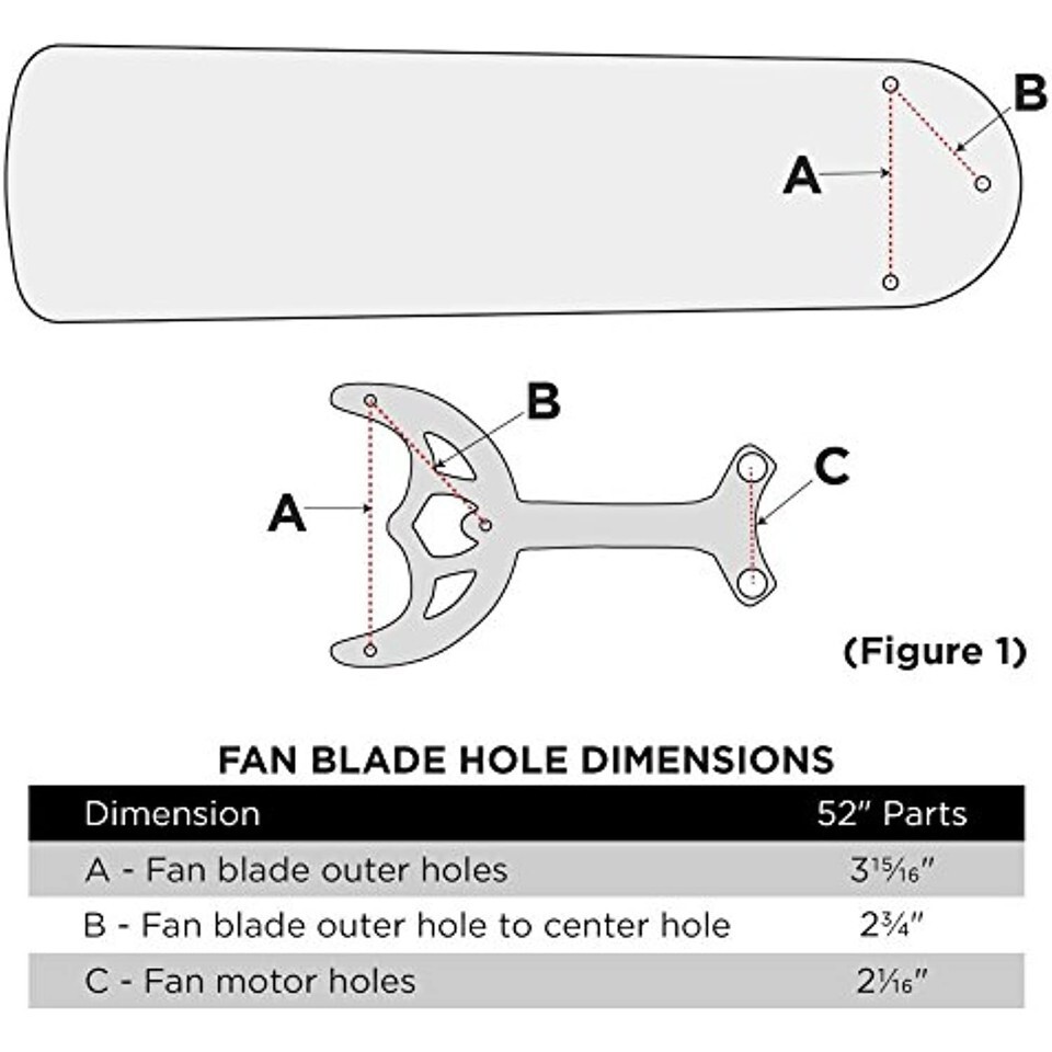Dimensions as shown in Figure-1; A - fan blade outer holes 3-15/16-inches; B - fan blade outer hole to center hole 2-3/4-inches; C - fan motor holes 2-1/16-inches