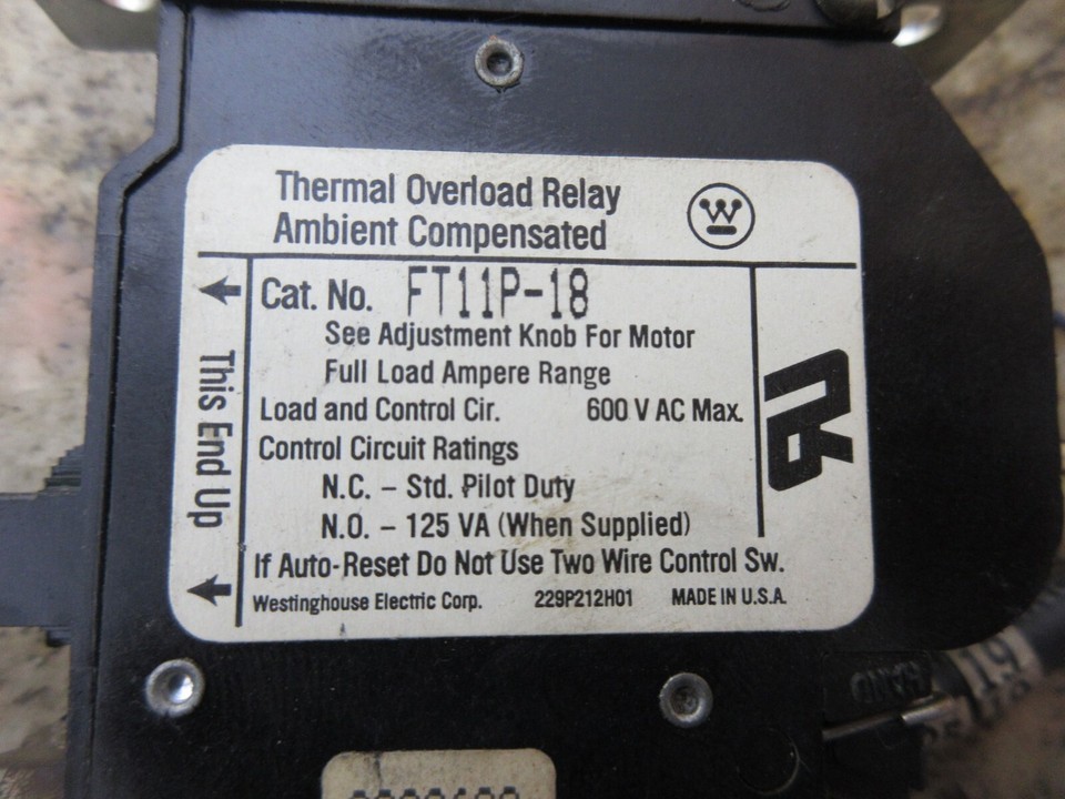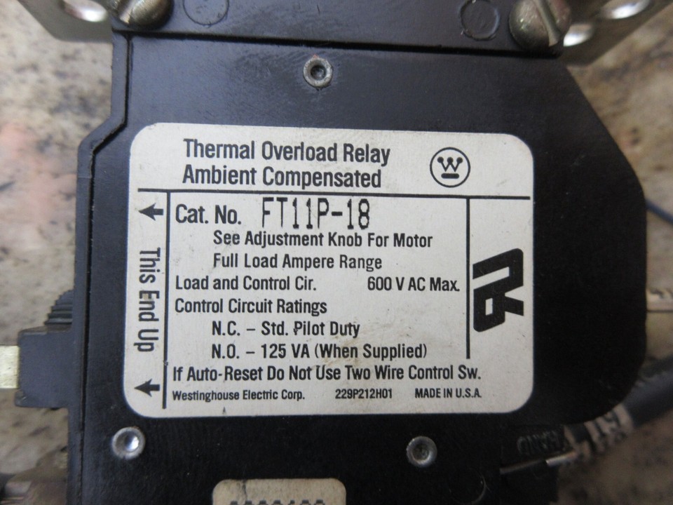 - WESTINGHOUSE THERMAL OVERLOAD RELAY FT11P-18 ELECTRIC MOTOR