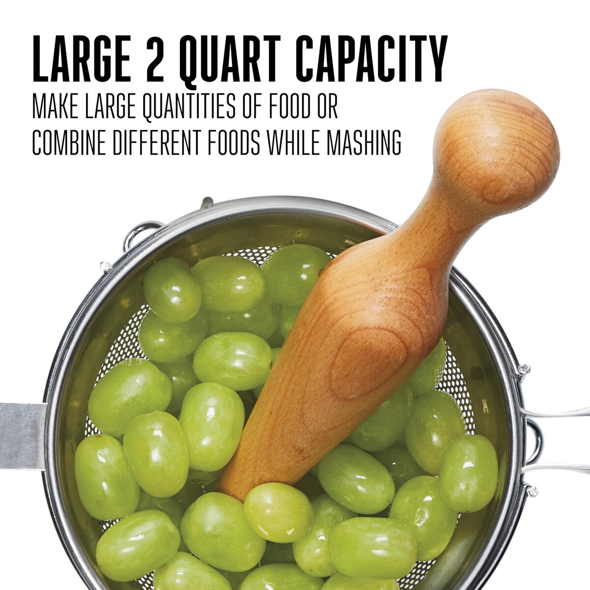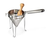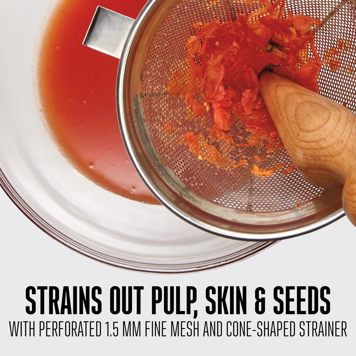 Bullet point: DURABLE 3 PIECE SET: This durable set includes the stainless steel cone strainer and support stand, and a solid-wood pestle. It's ready to use out of the box. It's perfect for making apple sauce, berry jams, tomato puree, mashed potatoes, and other foods.