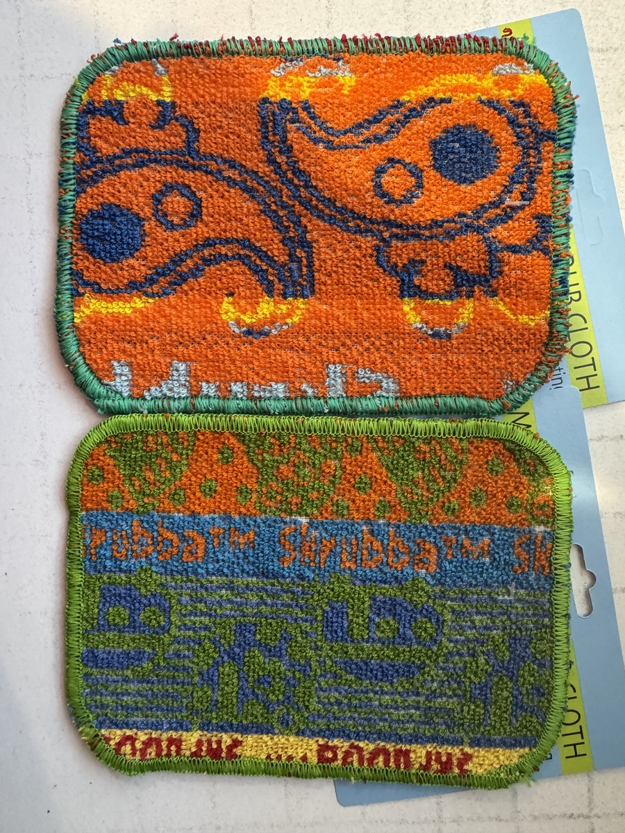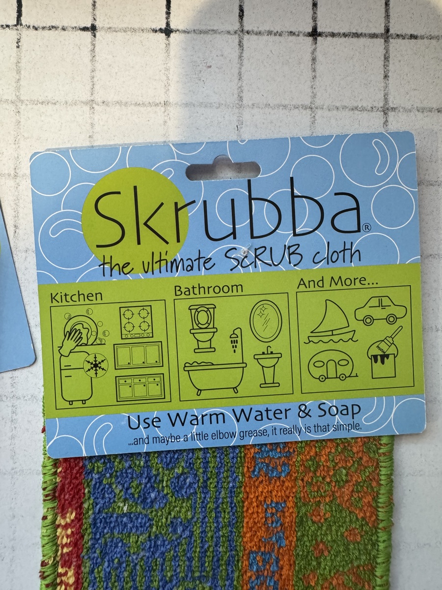 Safe for non-stick pots and pans, microwaves, ceramic-glass, cooktop stoves, granite, stainless steel, tiles, laminate floors, windows, and vinyl siding. Use on your RVs, fiberglass boats, outdoor furniture, pools and liners, and even tar on the exterior of your car surfaces.....without a SCRATCH! Never use toxic chemicals again, just a Skrubba and liquid soap! Important Note: The patterns have a general theme of design but will vary based upon how the product is manufactured. The images provide an idea of the designs incorporated. Manufacturer suggests testing the SKRUBBA on inconspicuous surfaces around the home first to ensure no unintended abrasion; many household surfaces vary in physical and chemical composition. A set of three cotton blend Skrubby's that will NOT SCRATCH most common household surfaces. Made in USA. 94% Cotton, 2% polyester, 4% eco-friendly non-toxic coating. Last 6 months under normal use. Can be cleaned in the dishwasher or washing machine. Color safe with bleaching agent. Safe for non-stick pots and pans, microwaves, ceramic-glass, cooktop stoves, granite, stainless steel, tiles, laminate floors, windows, and vinyl siding. Use on RVs, fiberglass boats, outdoor furniture, pools and liners, and even that road tar on the exterior of your car ... without a SCRATCH! Never use toxic chemicals again, just a Skrubba and liquid soap!