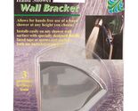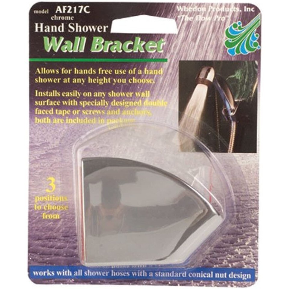 3 position, chrome plated plastic, wall bracket for use with a hand shower system, provides three different angles for shower spray to insure best angle for user to use hand shower hands free, installs on shower wall with screws anchors or double faced tape, both are provided, works with any hand shower system with conical hose nut design.