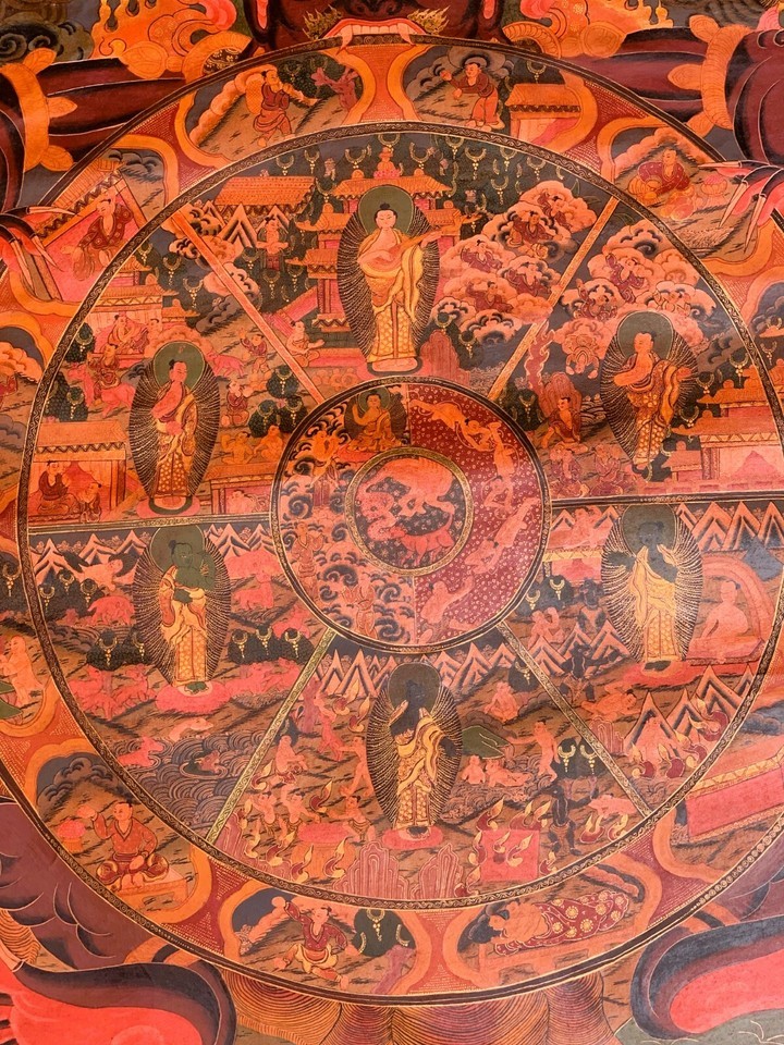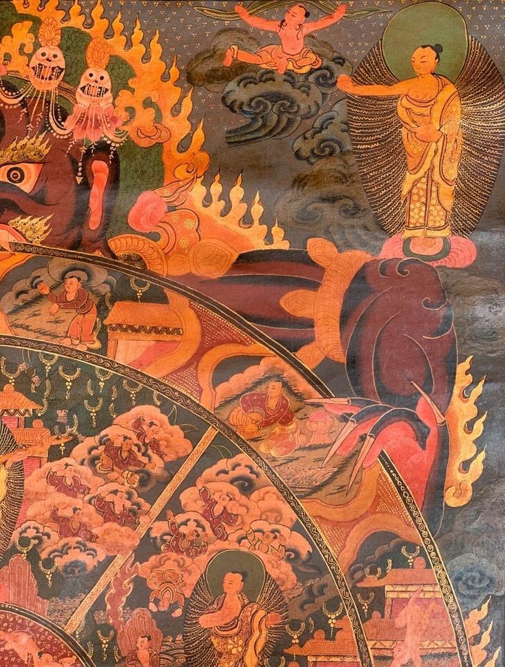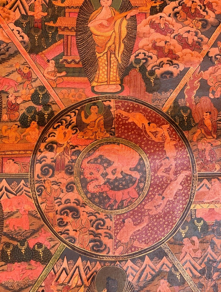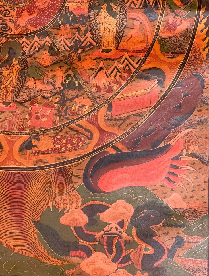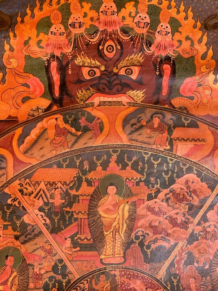 - WHEEL OF LIFE RIDUK MANDALA OLD OIL VARNISHED ORIGINAL TIBETAN THANGKA PAINTING