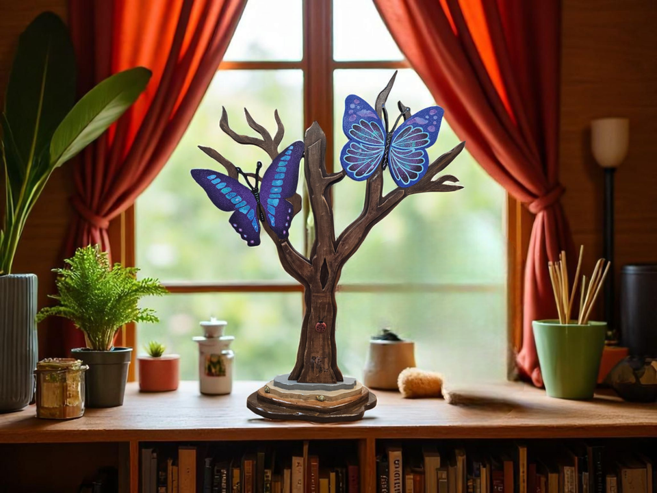 The Beautiful Butterfly Tree sculpture is a handmade wooden tabletop tree created by Alisa R Tarpley, also known as Art69. This medium-sized sculpture features a tree with butterflies, showcasing a whimsical yet contemporary art style with elements of outsider and folk art. Each sculpture is handmade and hand painted, making every sculpture an original one-of-a-kind work of art that highlights the themes of butterflies, trees and a mystery of insects that will vary with each sculpture. The artist's unique woodworking technique brings this piece to life, expressing great detail, and making it a standout addition to any art collection.