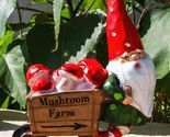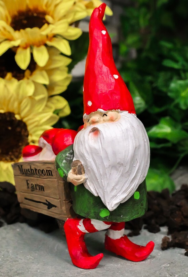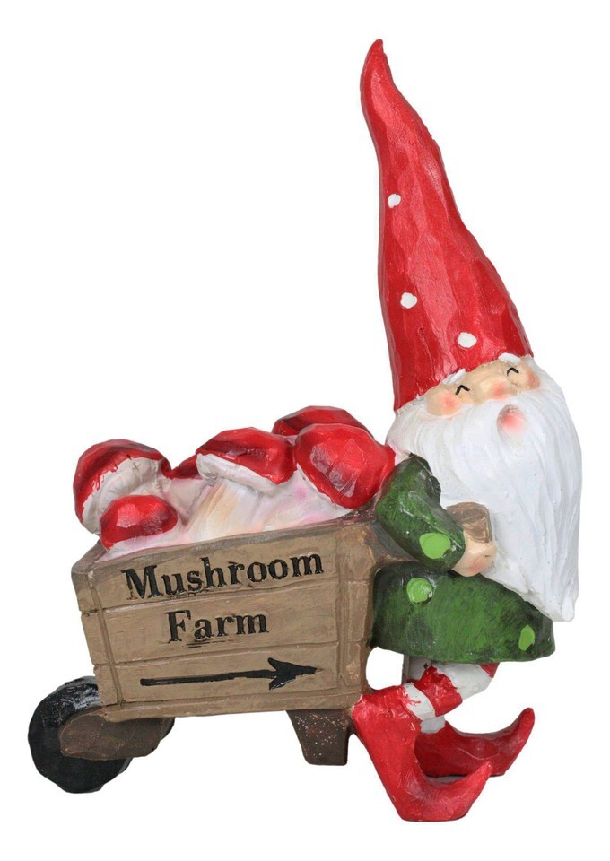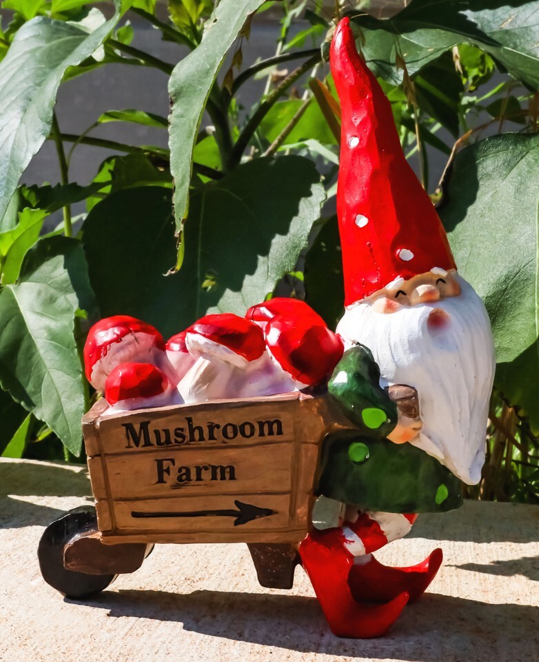 - Whimsical Farmer Gnome Pulling Farm Mushrooms Wheelbarrow Fairy Garden Figurine