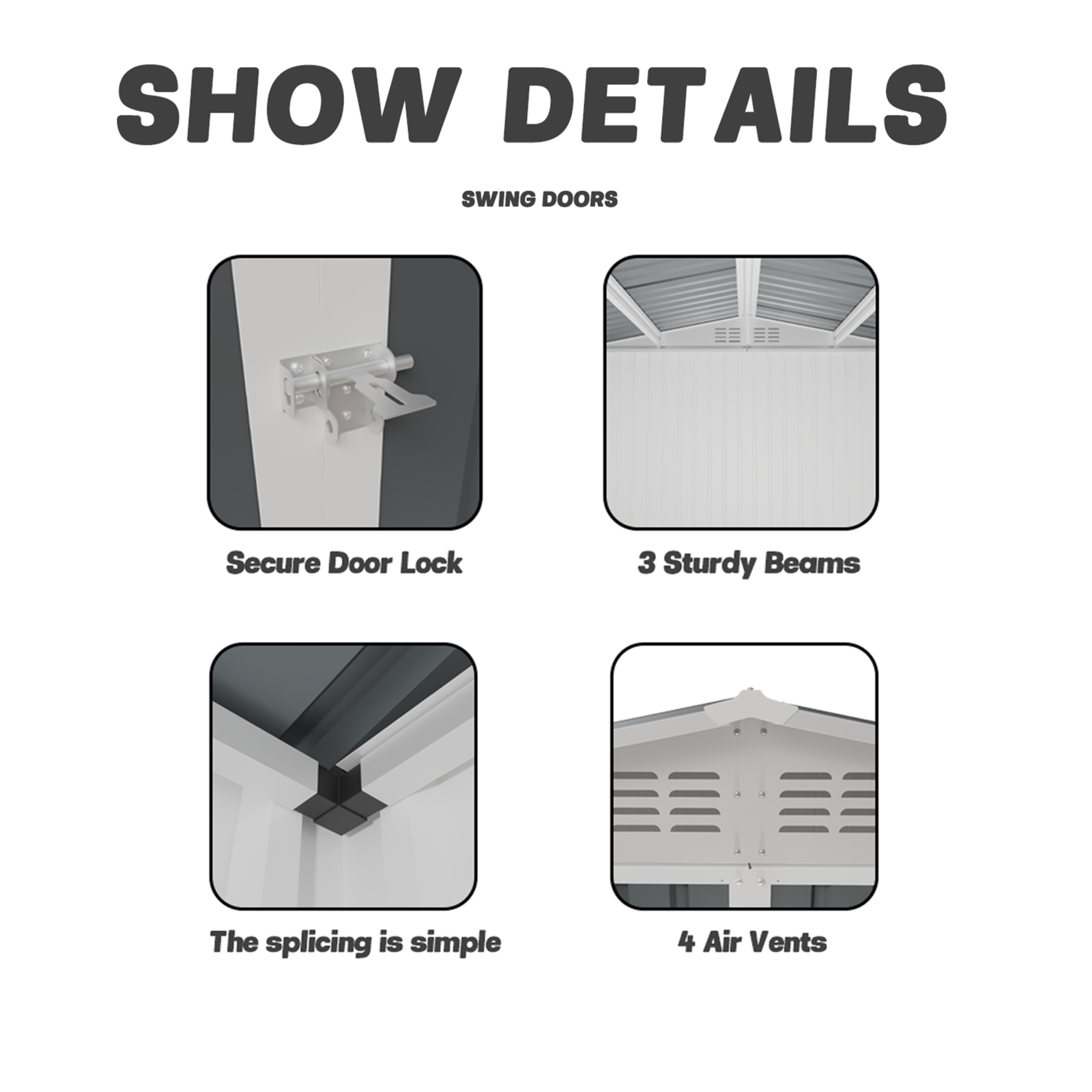 - White 10x8 Outdoor Garden Shed | Aluminum Frame, Hinged Door, Storage