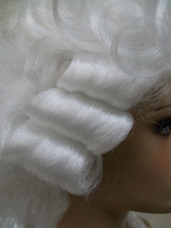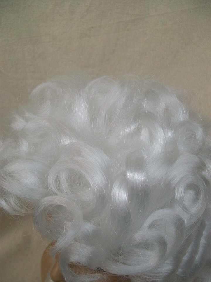 Historic looking style. Pinned Curl Rolls on the sides with hairpins to hold them in place. Hair pins are visible. White Hair. Coarse Frizzy Fiber. Can be teased more if a bigger look is desired. I would recommend using fingers or a wide tooth comb to style. No brush, as it would separate the fiber too much and cause a frizzy mess. Cap is bigger on this wig. Pinning may be required to secure in place. Adult: One size fits most. DOES NOT INCLUDE CHOKER.