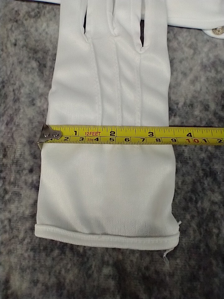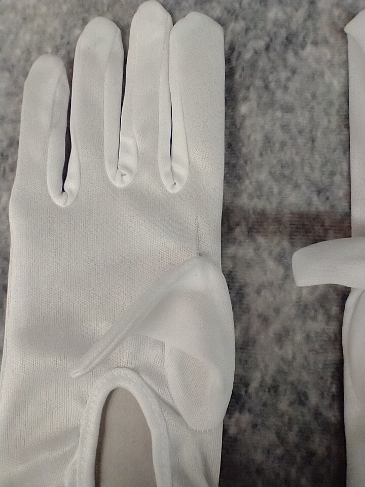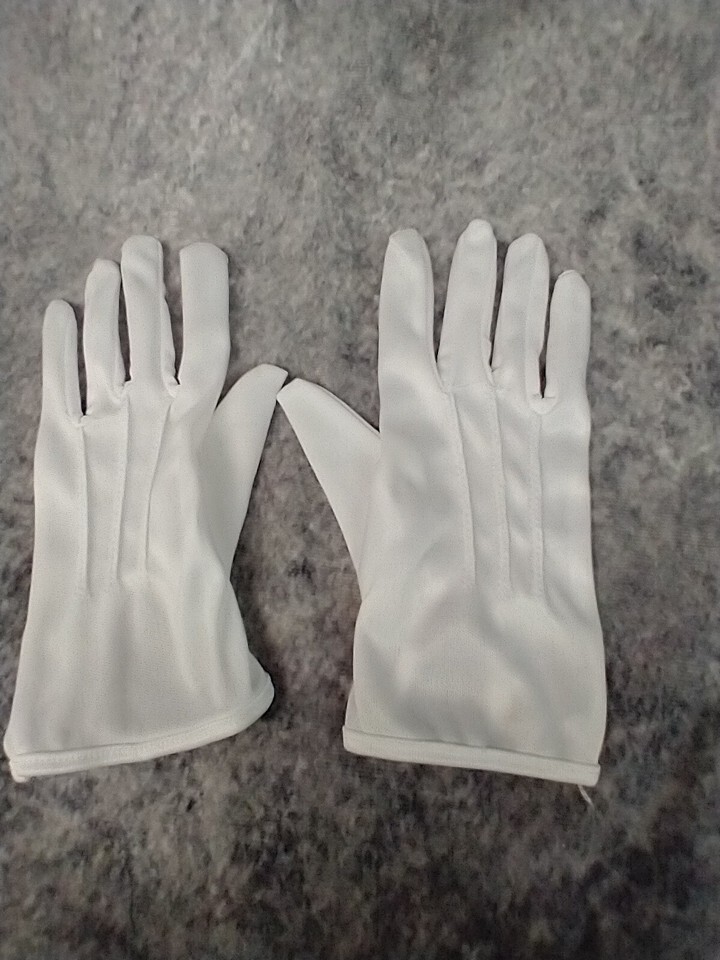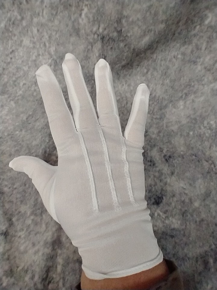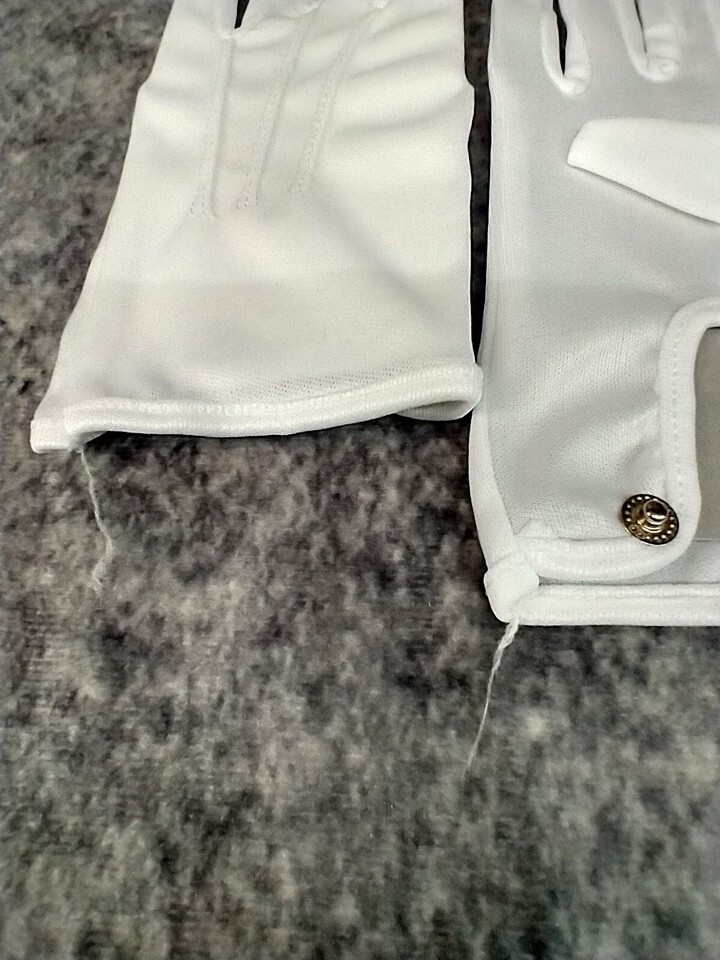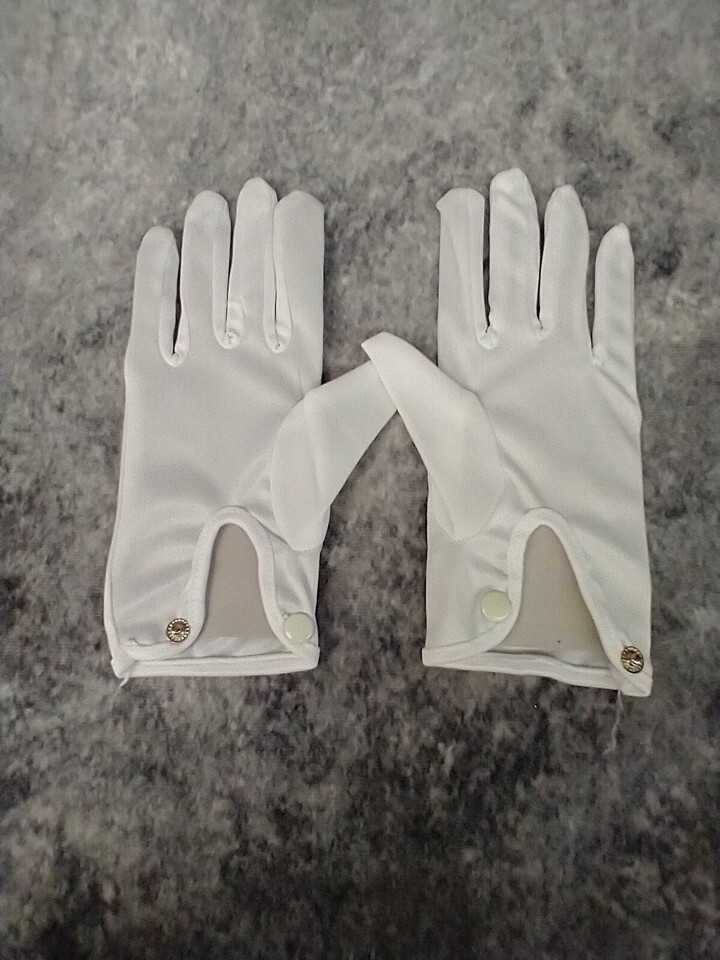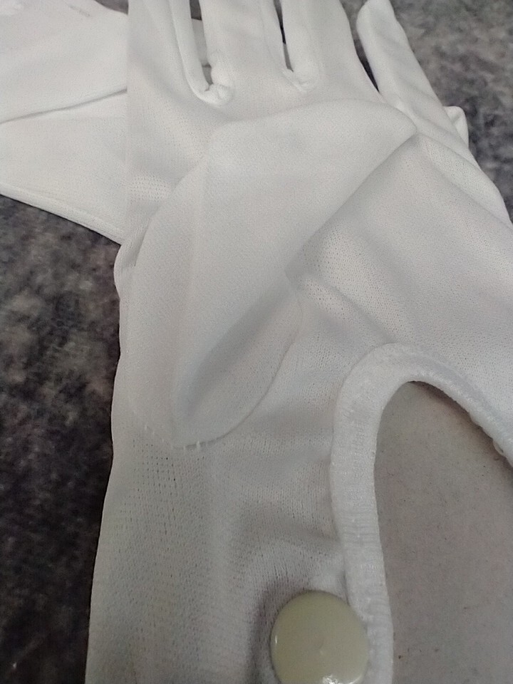 Theatrical Costume Gloves. White with snap. The top side has 3 lines sewn. The palm side is just