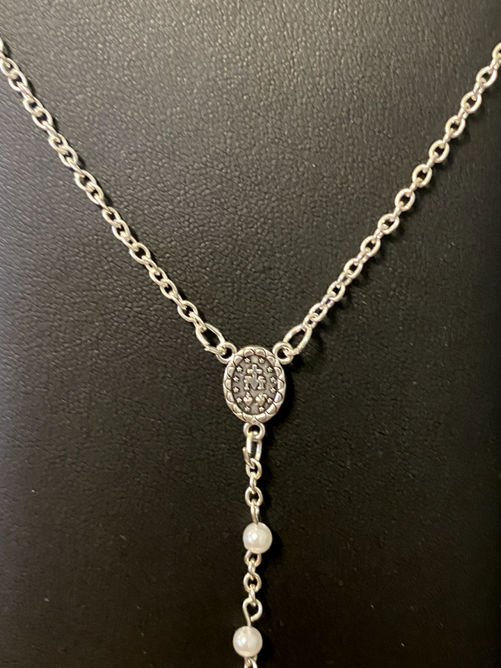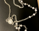 You are purchasing a beautiful white imitation pearl 18"long rosary necklace. Center comes with silver tone accent medal with image Our Lady of the Miraculous Medal.