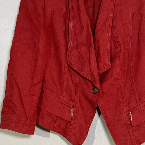 Made of 60% Lyocell, 22% linen, 18% cotton. Features single button front closure, zippered front pockets, shoulder pads, and has heavy stitching.