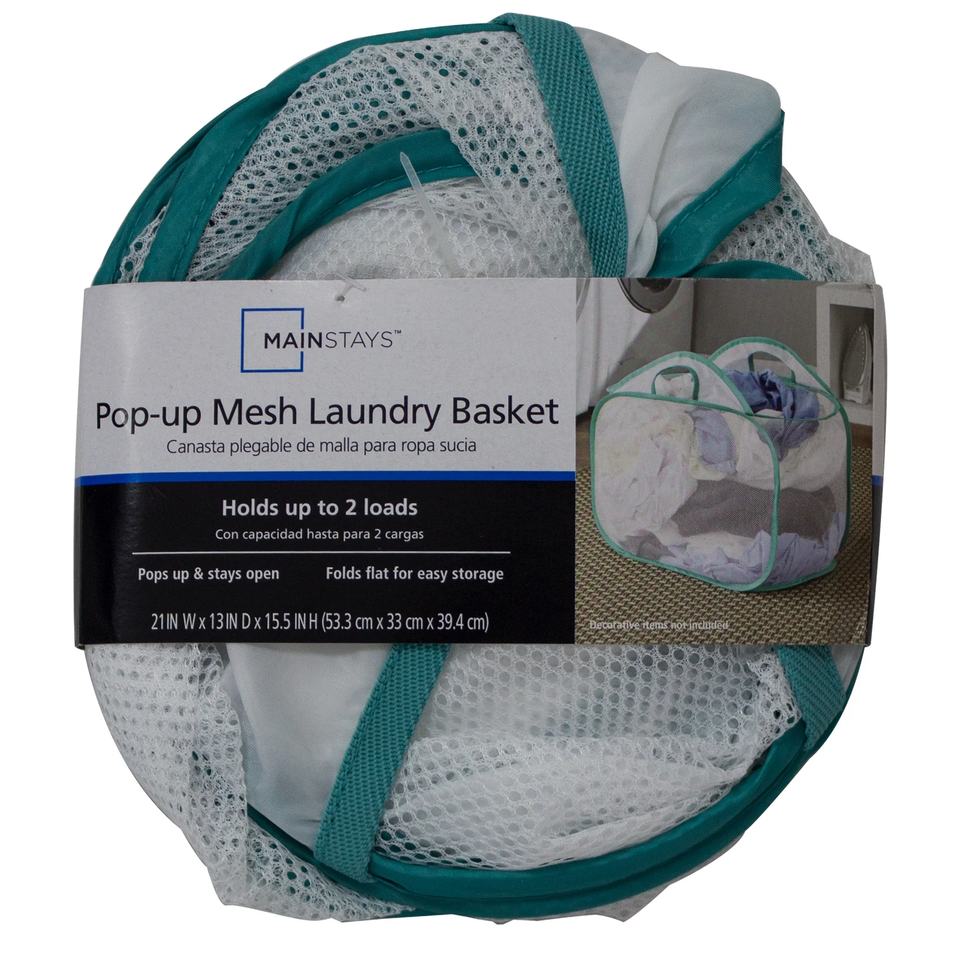 The Mainstays Pop-Up Mesh Laundry Hamper is a lightweight and versatile storage solution. Made from breathable white polyester mesh, it ensures proper ventilation and features two heavy-duty carrying straps for easy portability. Its durable design makes it perfect for organizing clothing for all ages, as well as towels, toys, and other household items. When not in use, the hamper conveniently folds flat for compact storage. Caution: This item is under spring pressure; use caution when opening and keep it away from children and your face.