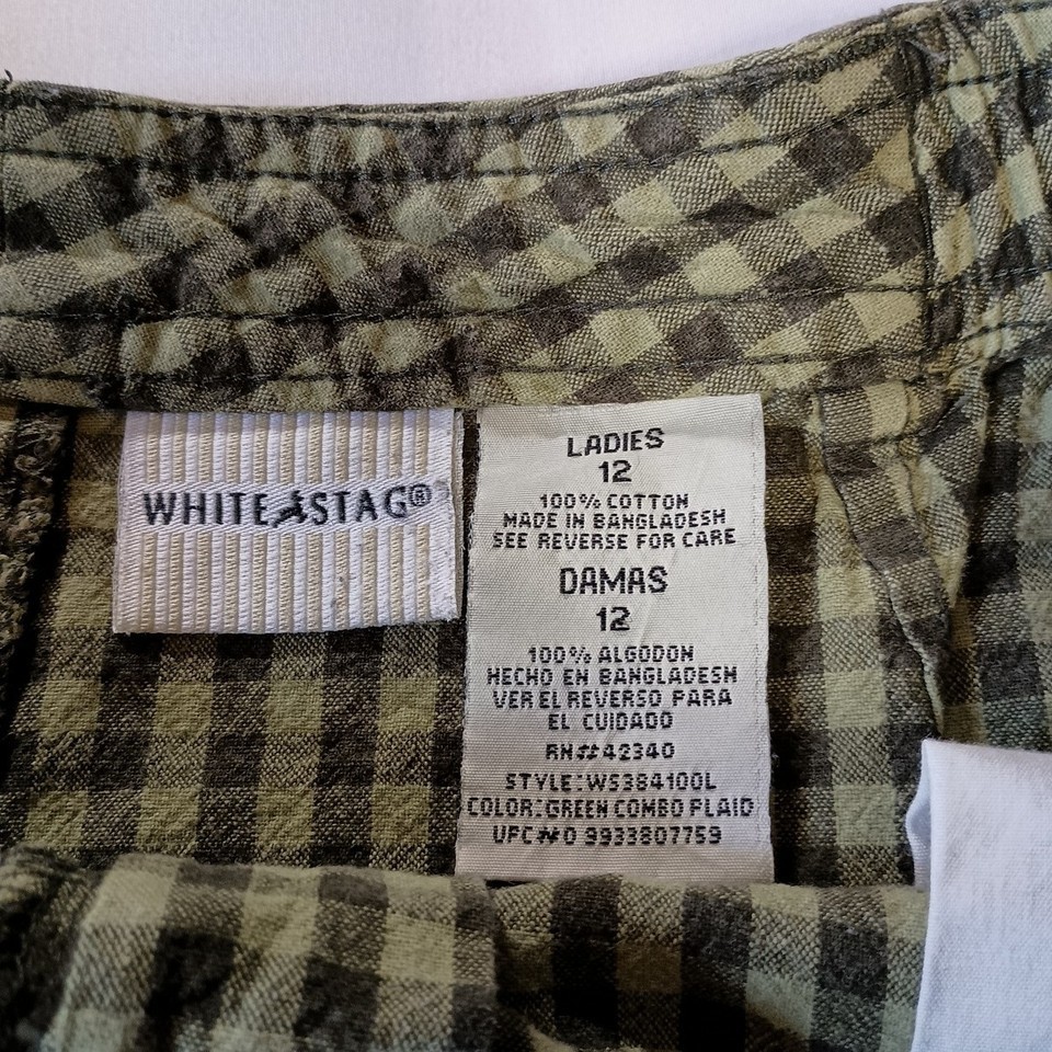 These White Stag Chino Shorts in women's size 12 feature a stylish green and black checkered pattern, making them perfect for a casual occasion. Made from 100% cotton twill fabric, they are easy to care for and machine washable. The chino style, flat front design, and belt loops offer a classic and modern look, while the slash pockets add a practical element to the shorts. Ideal for summer, fall, and spring, these shorts are a versatile addition to any wardrobe. Normal wear.