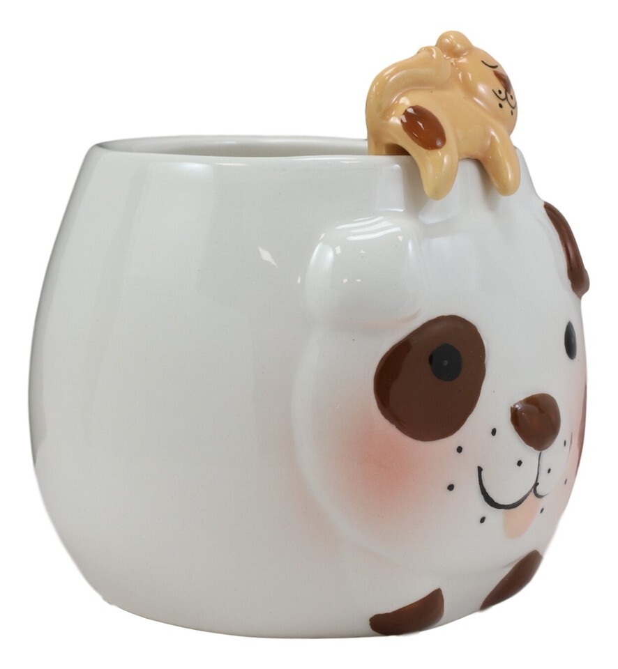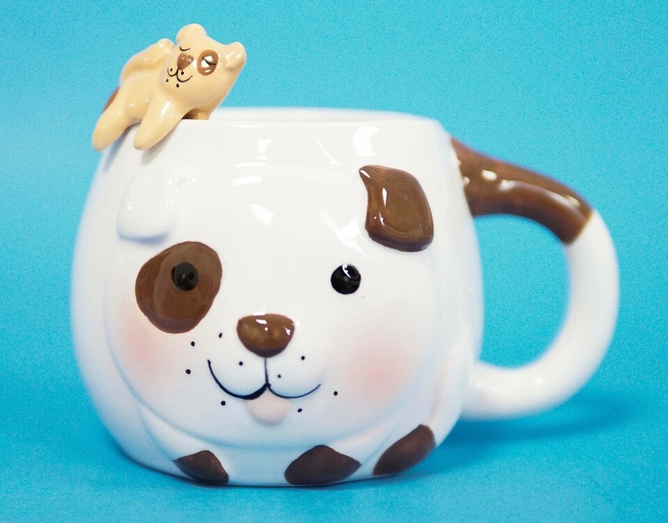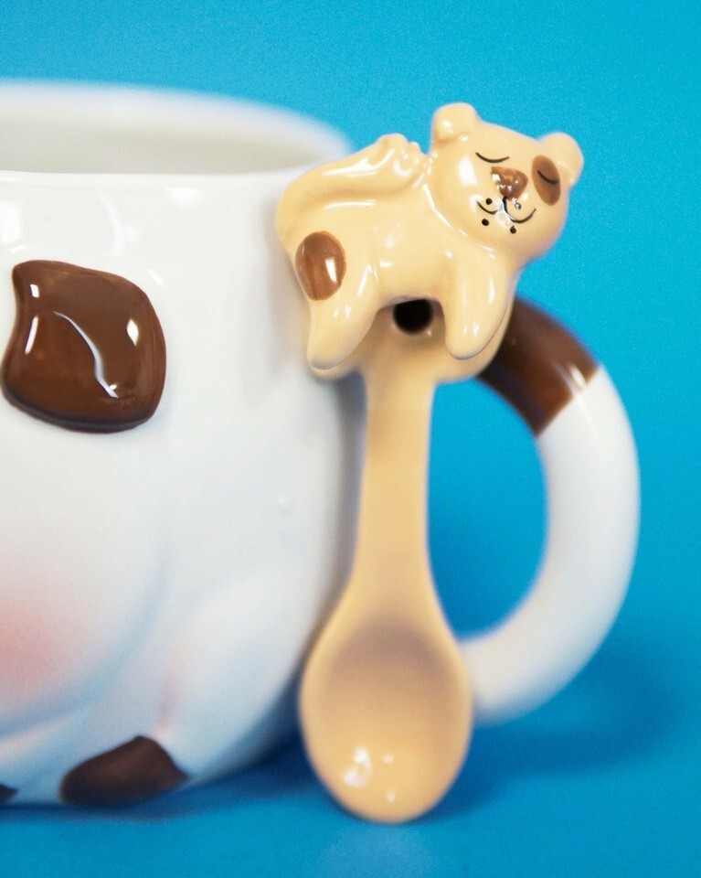 This animal mug with latching spoon set is double walled for higher durability, better handling and ease of cleaning. This whimsical mug features a white tramp dog face with chocolate spots and freckles along with its fat body behind its head. The mug is accompanied by a latching spoon with a sleeping puppy handle top. When attached to the mug's rim edge, the puppy on top of the spoon appears to be in complete relaxation with its legs hanging down the top loosely.