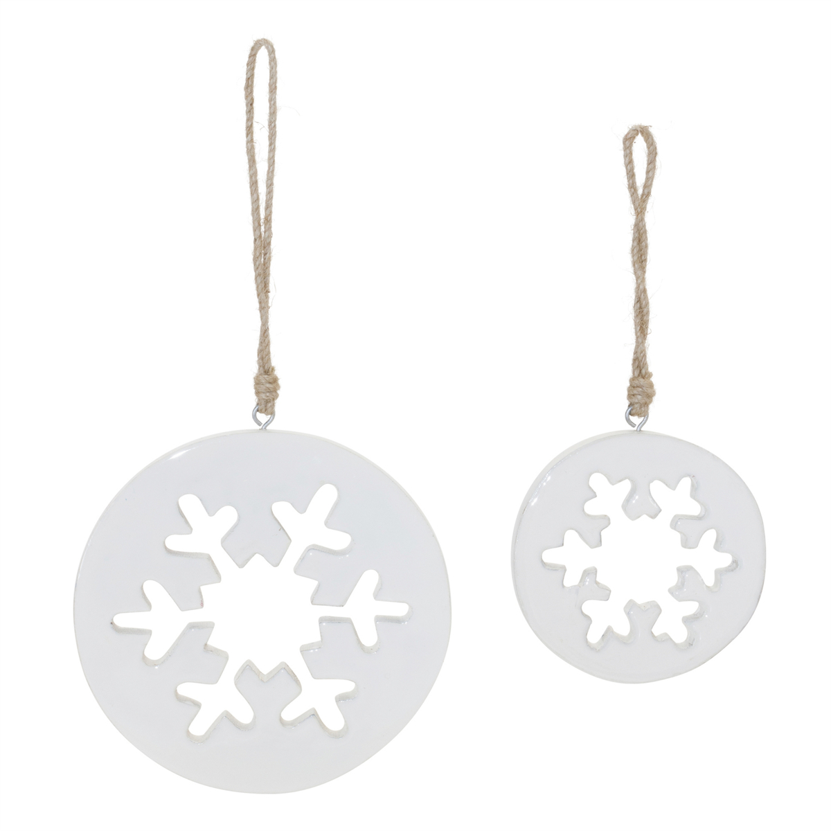Add a charming, rustic touch to your holiday decor with this set of White Wood Snowflake Cut-Out Ornaments. Crafted from solid wood and featuring a delicate cut-out snowflake design, these ornaments bring a timeless wintery feel to your Christmas tree. Each ornamnet is finished in crisp white with a natural jute string for easy hanging. Whether adorning your own home or given as a thoughtful holiday gift, these ornaments are perfect for creating a warm and festive seasonal display. Sold in a set of twelve pieces with two assorted sizes to create a balanced display on your Christmas tree.