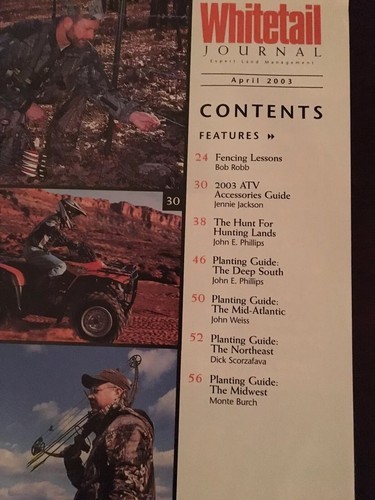 Whitetail Journal April 2003, Master Planting Guide, fencing lessons, the hunt for hunting lands, deer management, ATV accessories and more. 72 pages in good condition.