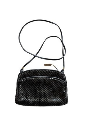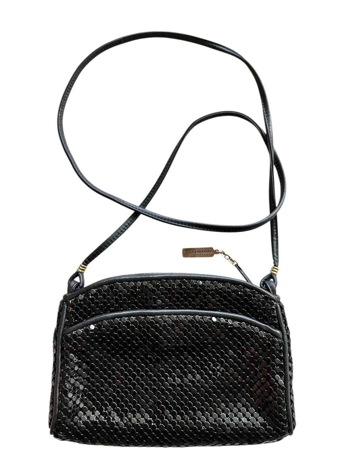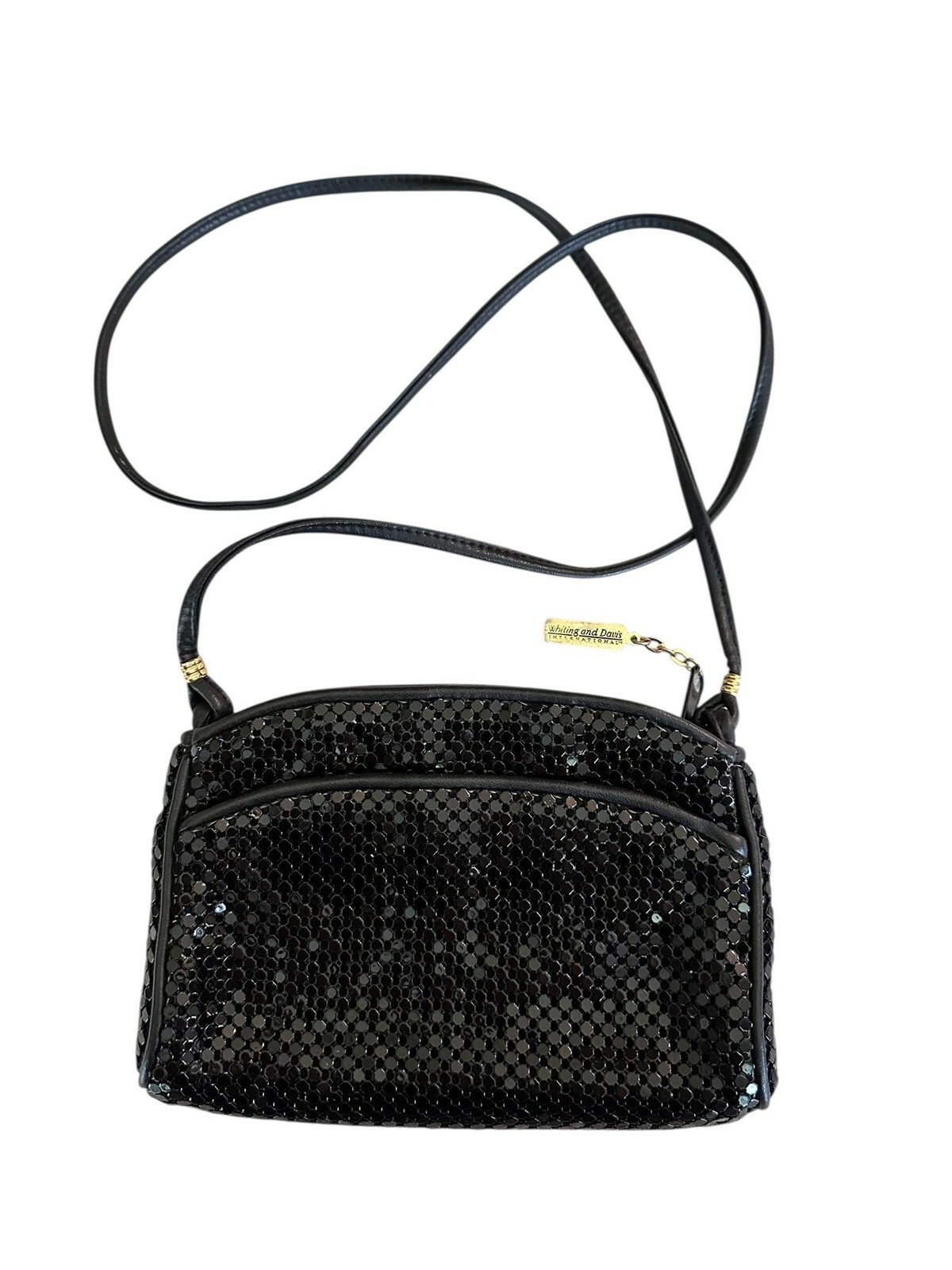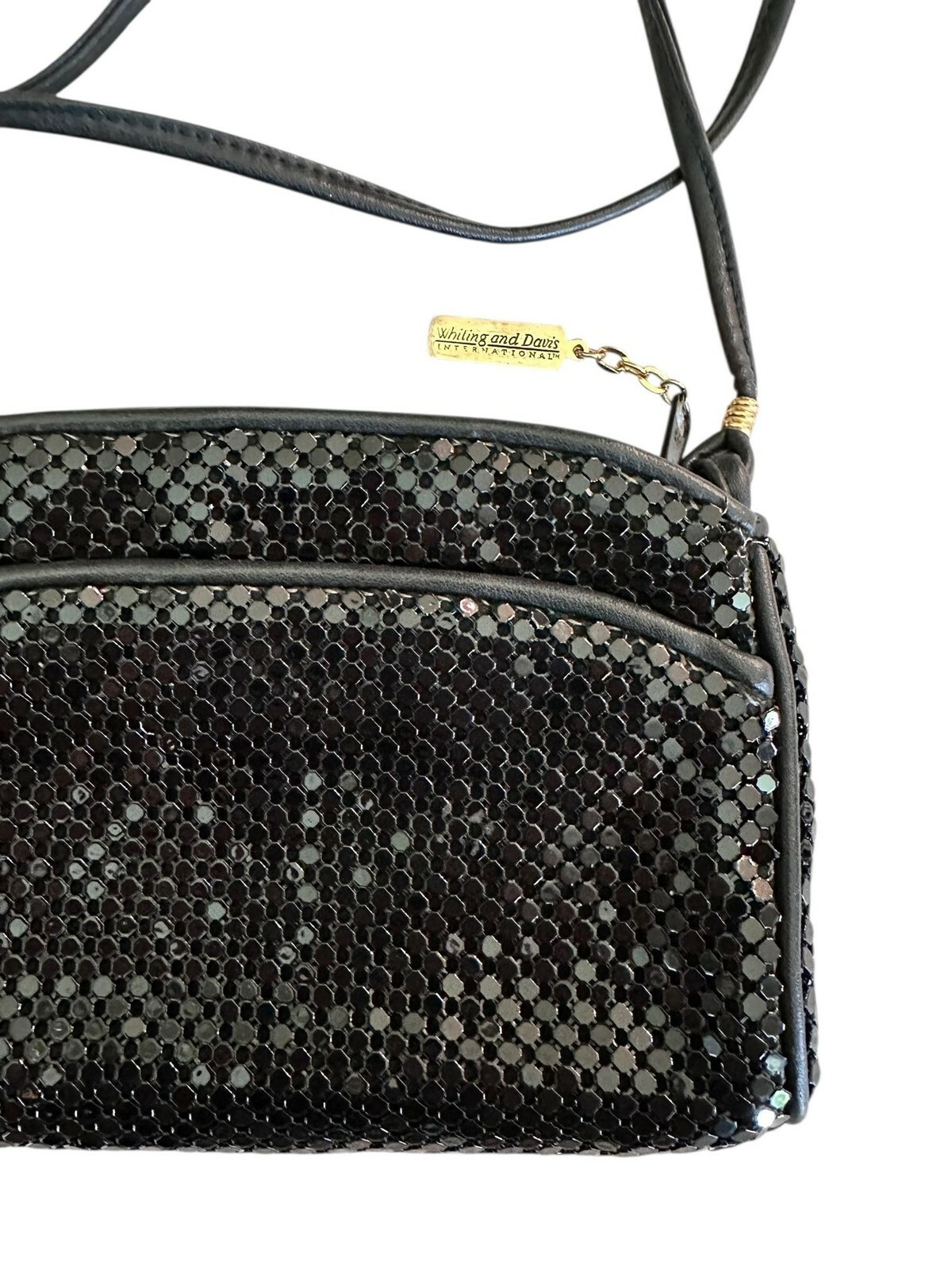 - Whiting and Davis vintage black mesh metal crossbody purse on a leather strap