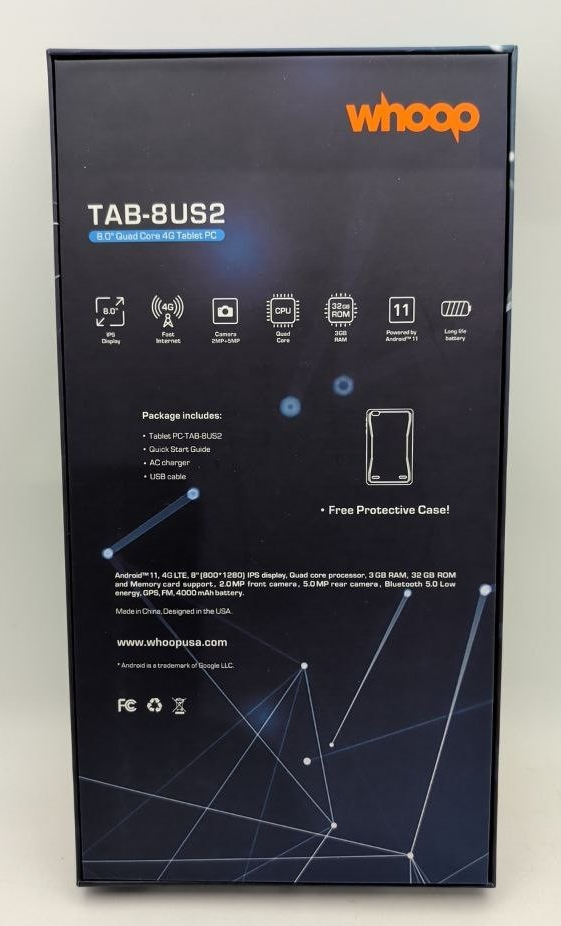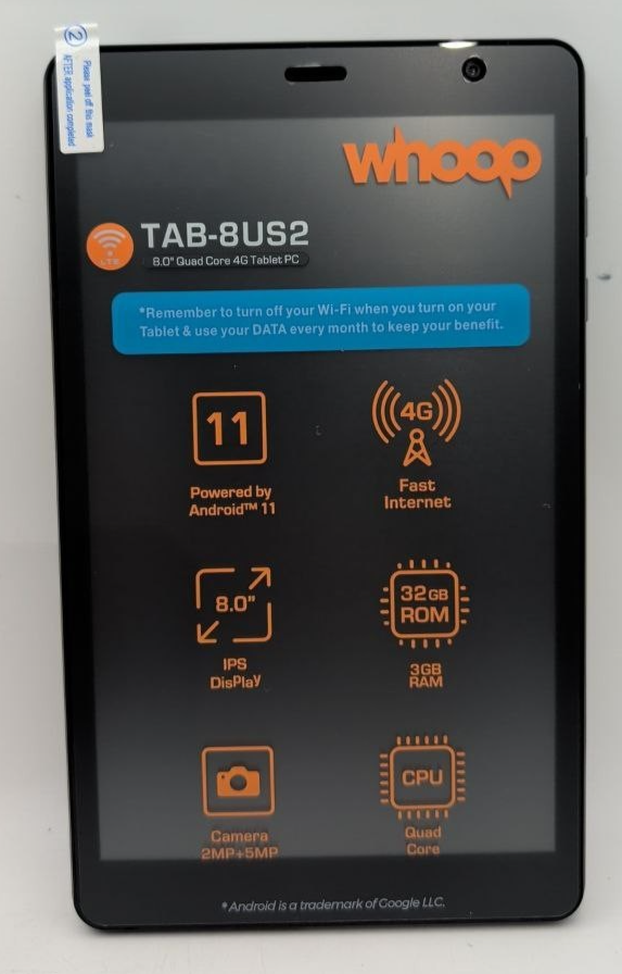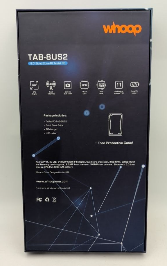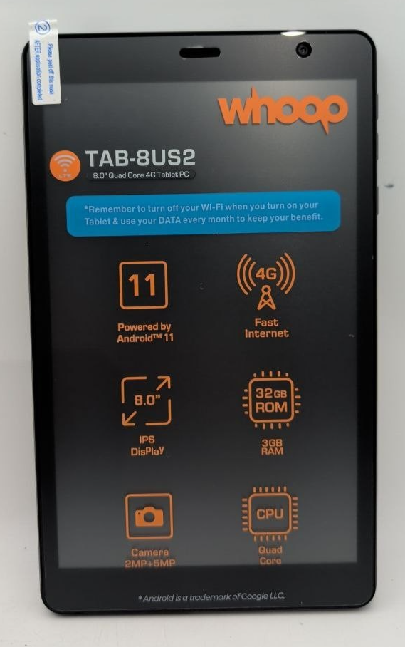 - Whoop TAB 8US2 Android Tablet 32GB 8" HD Display Quad core 5MP Camera 4G LTE