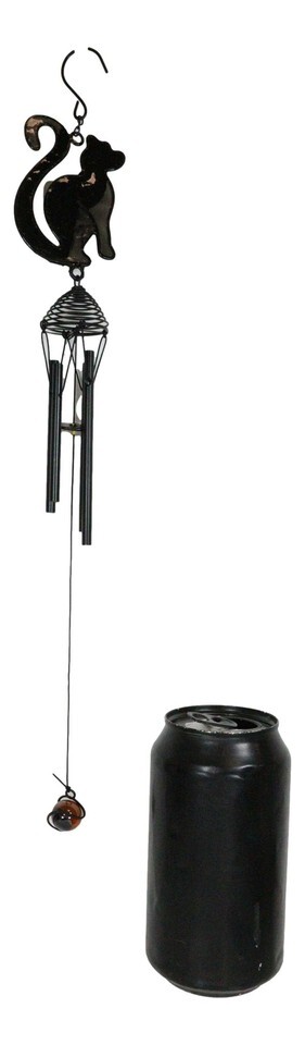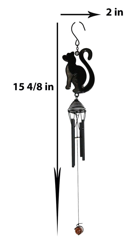 ? This mythical Black Cat wind chime measures 15.5" High, 2" Wide and 1.5" Deep approximately. It weighs about 2 ounces.