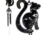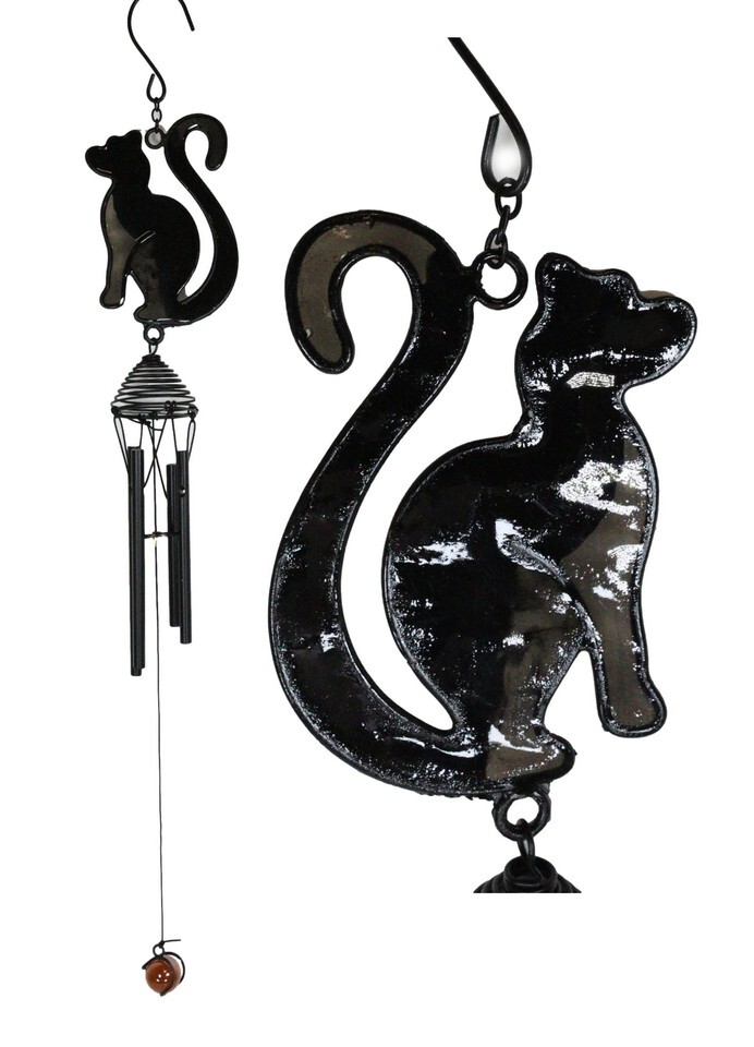 ? This mythical Black Cat wind chime is made of metal and stained glass, embellished with a glass gem at the bottom of the string.