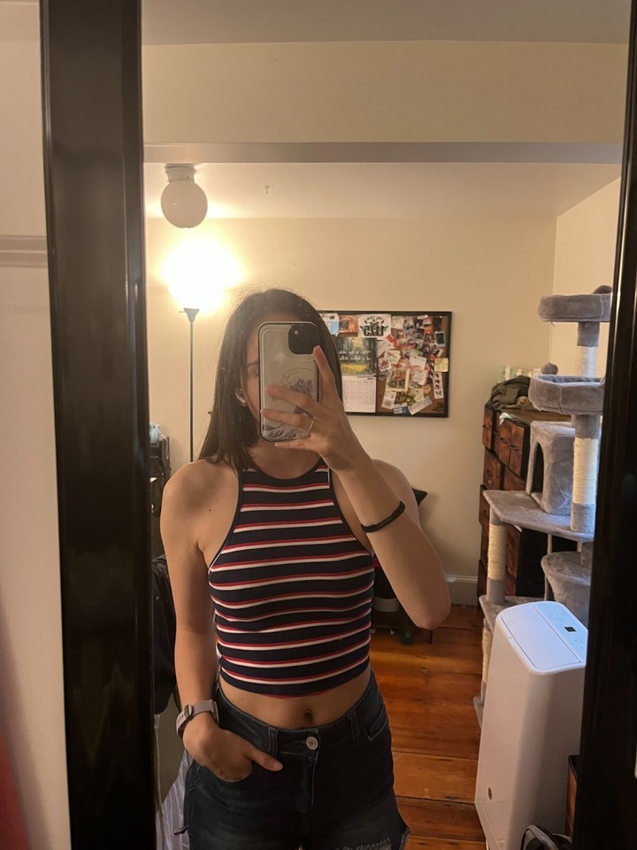 The Wild Fable Top for Women in XS is a stylish halter sleeveless crop tank top in a blue and red striped fabric. This lightweight and stretchy top is perfect for all seasons, making it versatile for various occasions. The pullover closure and halter strap add a trendy touch to the cropped design, which is ideal for a casual yet chic look. Made from a comfortable cotton blend, this top is easy to care for with machine washable instructions. Perfect for those who enjoy a blend of Western, beach, biker, princess, bohemian, and outdoor themes in their wardrobe.