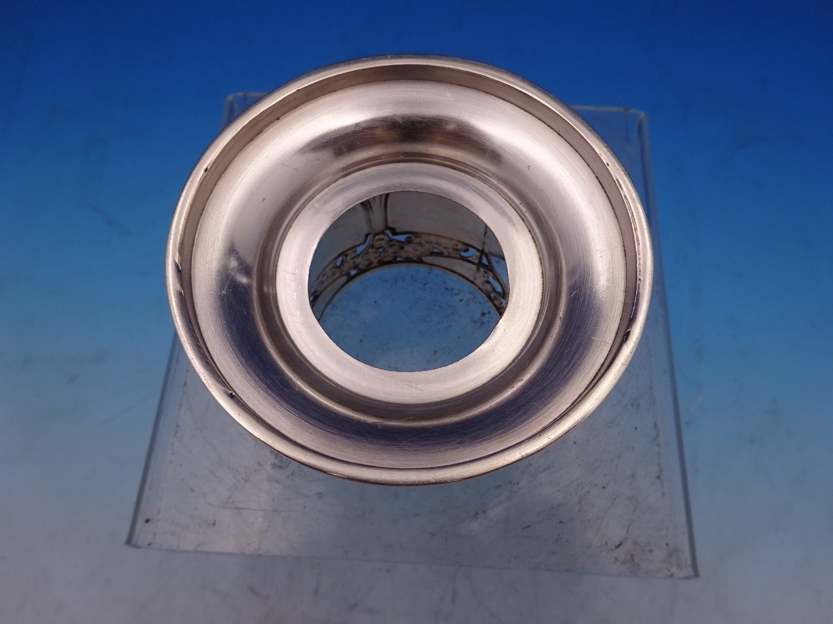 Wonderful William Hutton and Sons English Victorian Art Nouveau sterling silver base / holder pierced with flowers (no insert). It was made in London circa 1899. This holder measures 2 1/4" tall, with 1 7/8" diameter opening, and 3" diameter (base), and weighs 2.3 troy ounces. troy ounces.