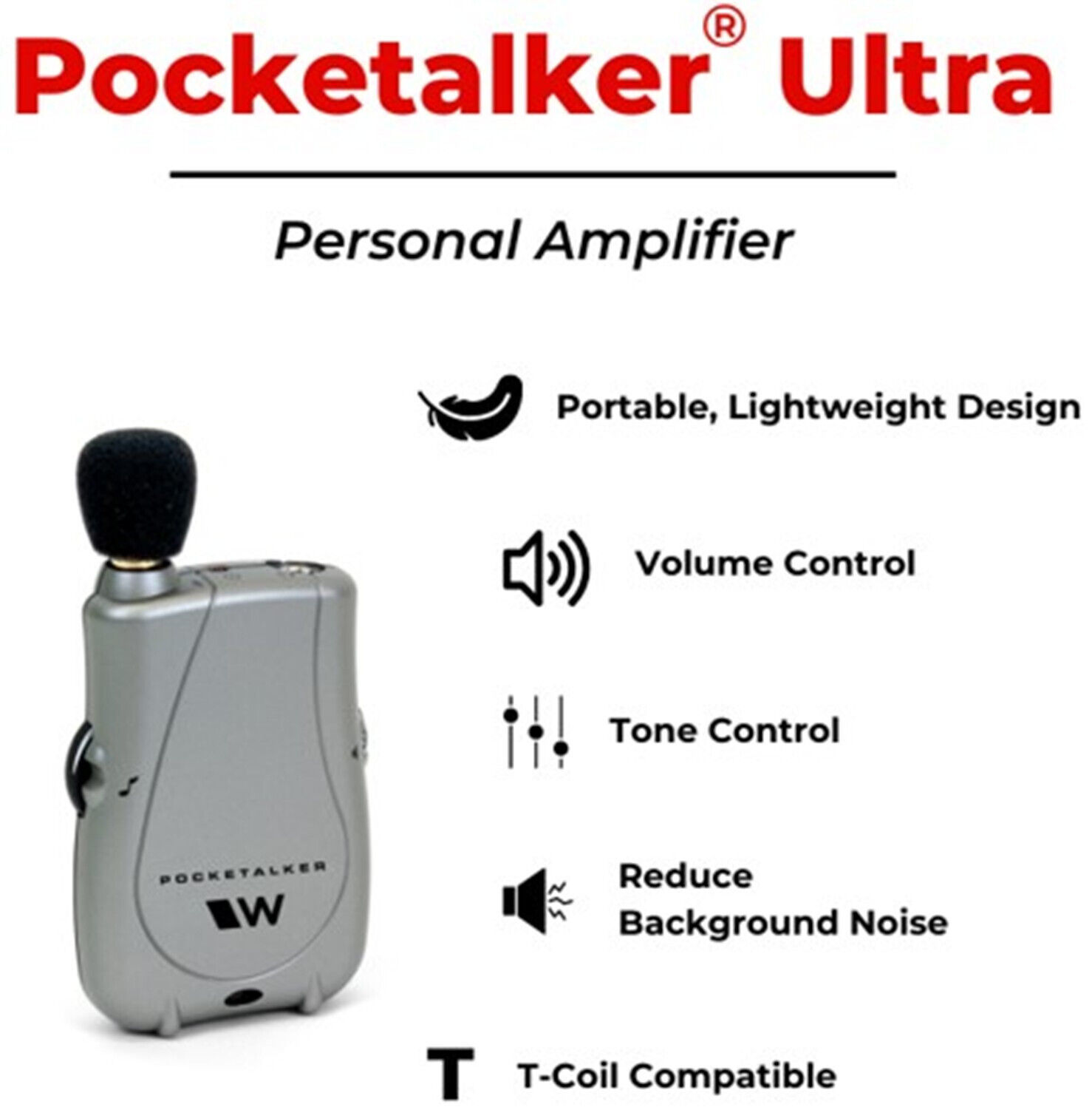 Pocketalker Ultra System amplifies sounds closest to the listener while reducing background noise. Ideal for one-on-one conversation, small-group and television listening, or conversing in the car. Use with or without hearing aids. Simply plug in your earpiece, position the microphone near the preferred sound, adjust volume to your comfort ? and start listening.