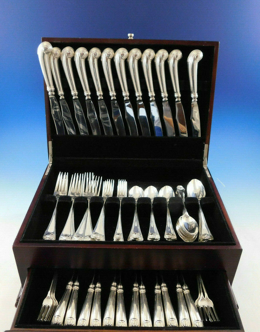 COMPLETE FLATWARE SETHOSTESS HELPERSHOLLOWWARE / TEA SETSMUSEUM QUALITY/FIGURAL SILVERFINE ESTATE VINTAGE JEWELRYMID-CENTURY MODERNSILVER FLATWARE SILVERWAREBuccellatiChristofleGeorg JensenNew Georg Jensen HollowwareNew Georg Jensen JewelryGorhamInternationalLuntMichael Aram - NewReed BartonTiffany Co.TowleWallaceWhitingPLACE SETTINGS