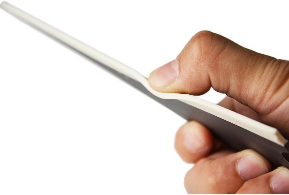 Soft squeegee blade along one edge and pointed hard-card tips on the ends for precision.