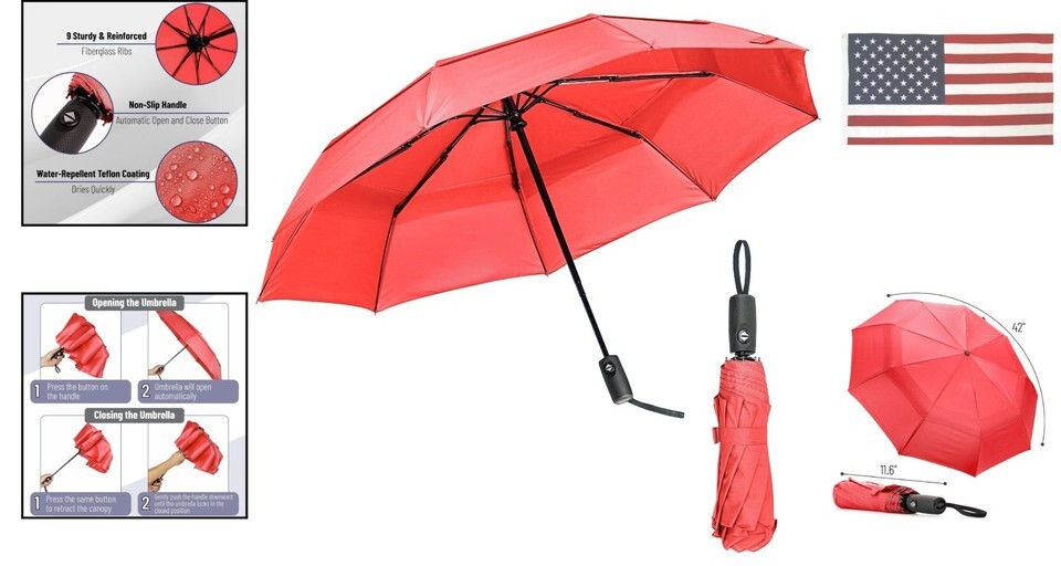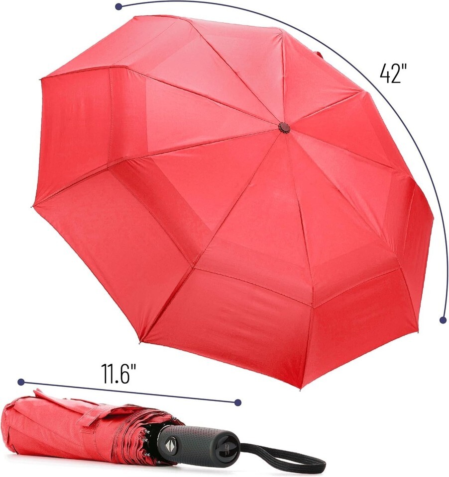 - Windproof Travel Umbrella Compact 42-Inch Canopy 9-Rib Automatic Open/Close T...