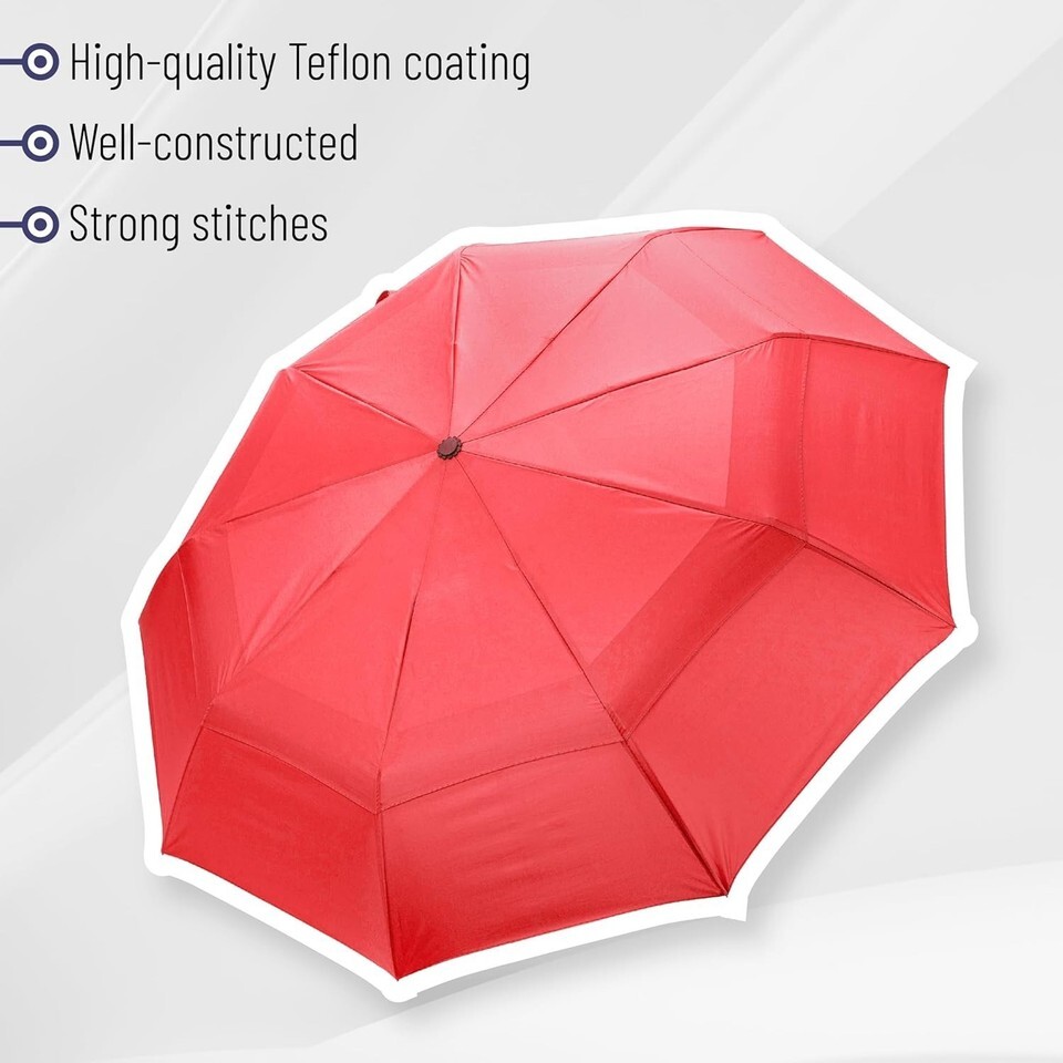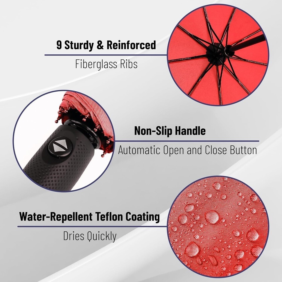 Windproof Travel Umbrella Compact 42-Inch Canopy 9-Rib Automatic Open/Close Teflon Coated Non-Slip Handle Radiant Rouge