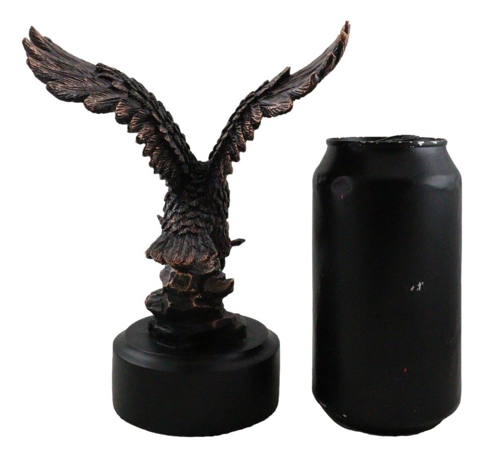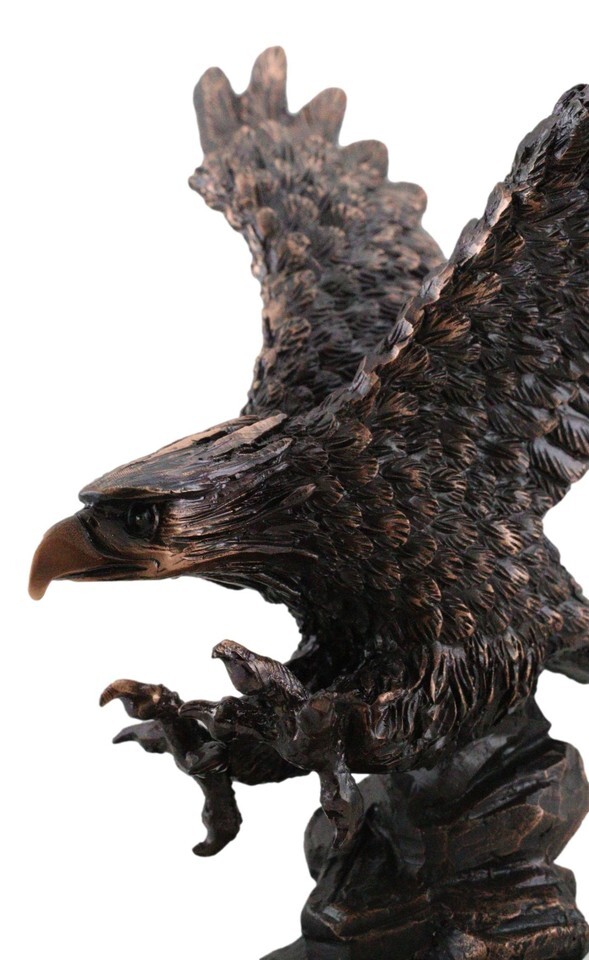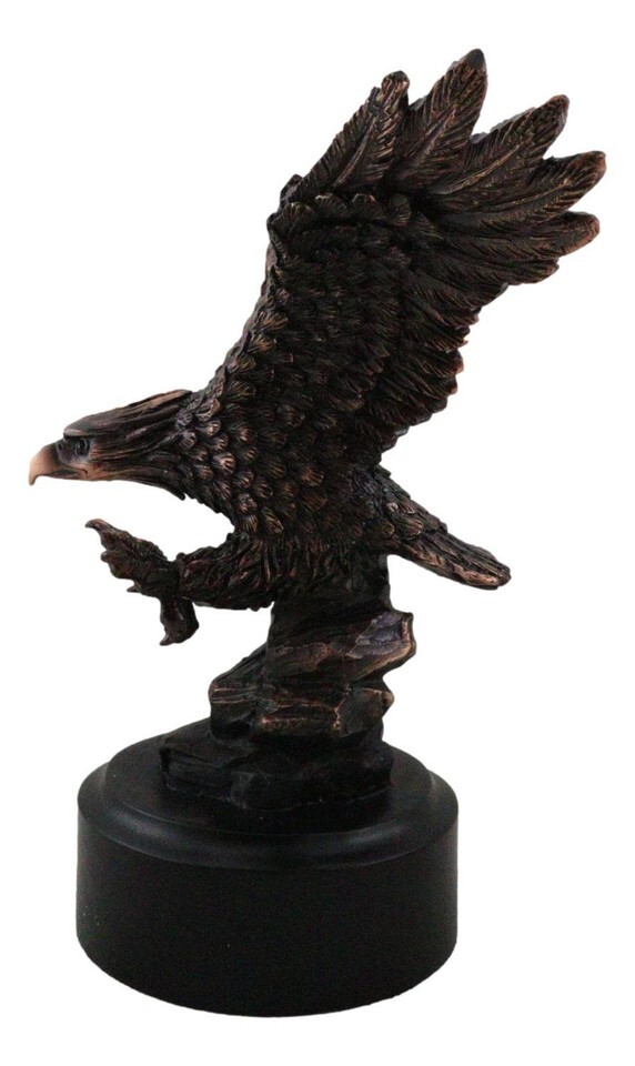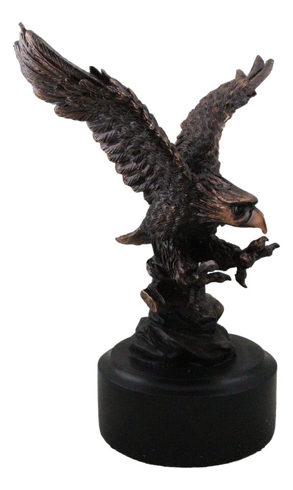? This Majestic Bald Eagle Figurine is made of the highest quality resin, undergoing the process of bronze electroplating giving it a uniform shine on the inside as well as the surface of the figurine. To add sculptural aesthetics and display worthiness, we add accent faux black wooden base to the sculpture.