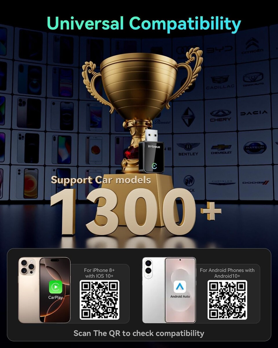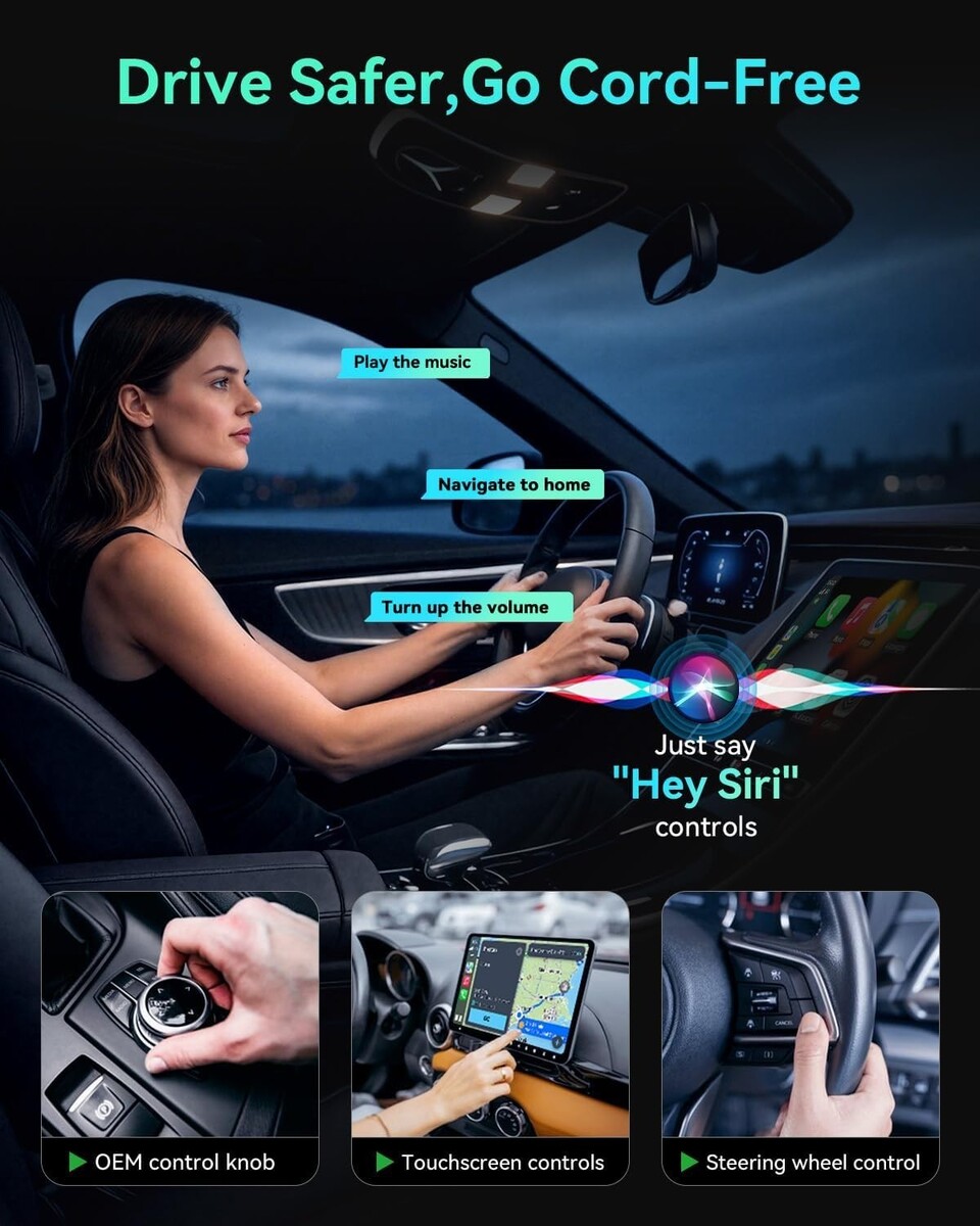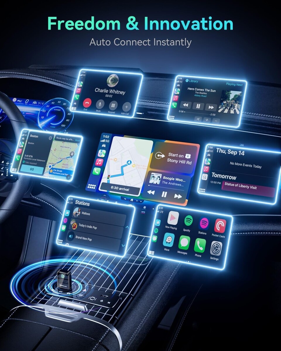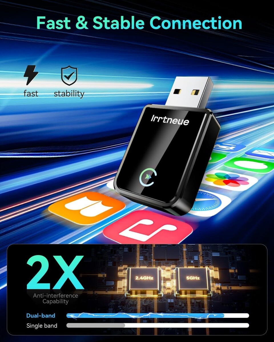 Stable Wireless Performance for Worry-Free Drives: Enjoy a smooth, low-latency experience with powerful 2.4GHz + 5.8GHz dual-band technology. Whether you're streaming music, navigating, or taking calls, your wireless connection stays stable-even on long trips or through signal-heavy areas.