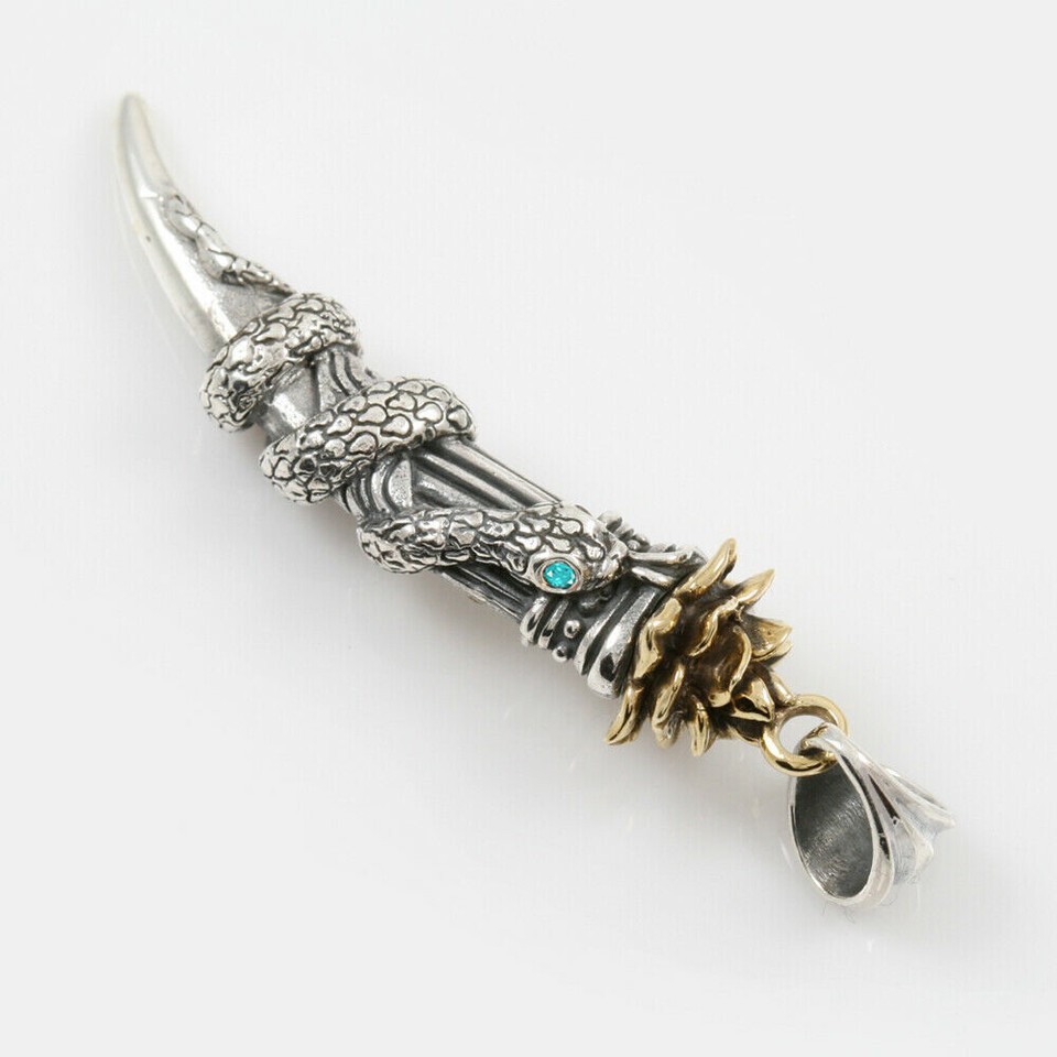 This beautiful pendant from Giani Inspirations features a golden lotus flower with a serpentine design, representing the energy of Kundalini. The pendant is made of 900 silver and features a round, natural green cubic zirconia stone. The horn-shaped pendant is perfect for those interested in signs and symbols, and its unique style makes it a great addition to any jewelry collection. The pendant is crafted in the United States and is perfect for anyone looking for a high-quality, antique-inspired accessory.