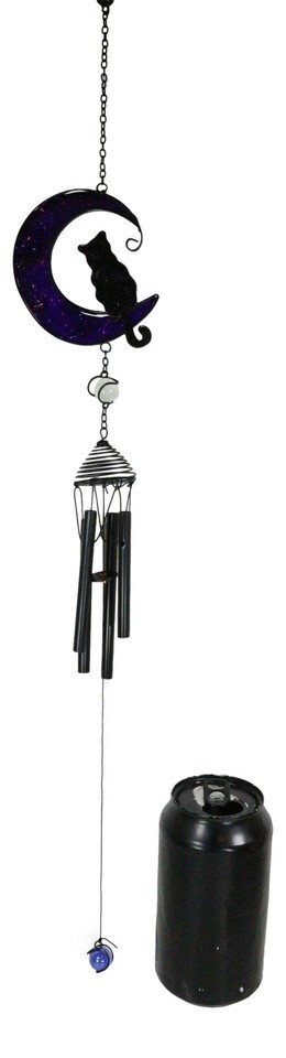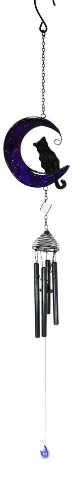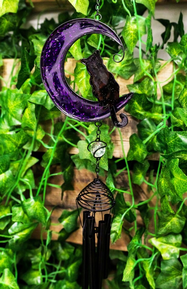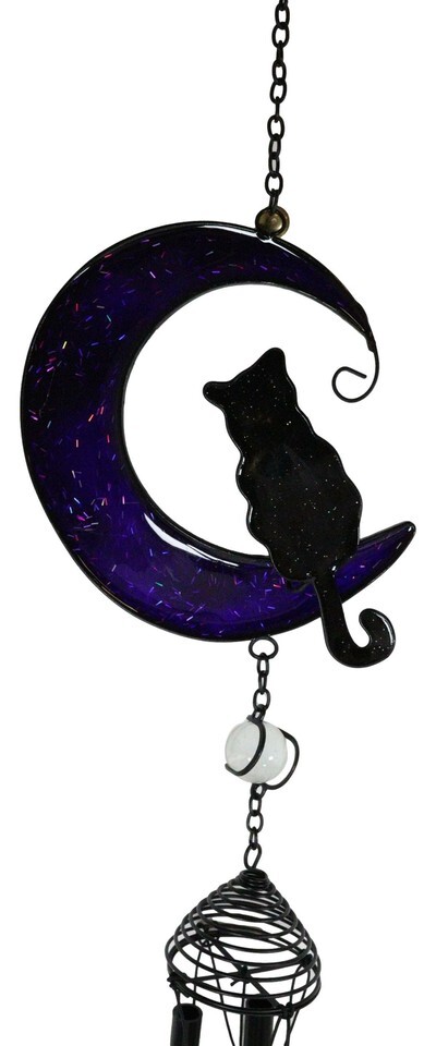 ? Looking for a way to add some witchy style to your favorite outdoor space? Make sure to check out this one! This metal wind chime features a hook on a chain at the top for hanging. The chain connects to a crescent moon design. A black cat sits on the purple crescent moon. Its tail hangs below the moon.