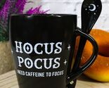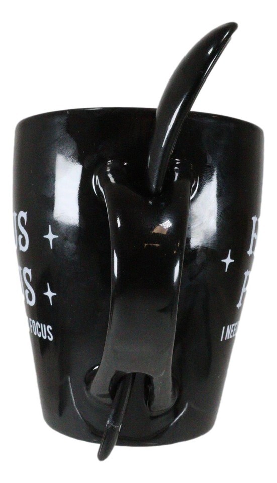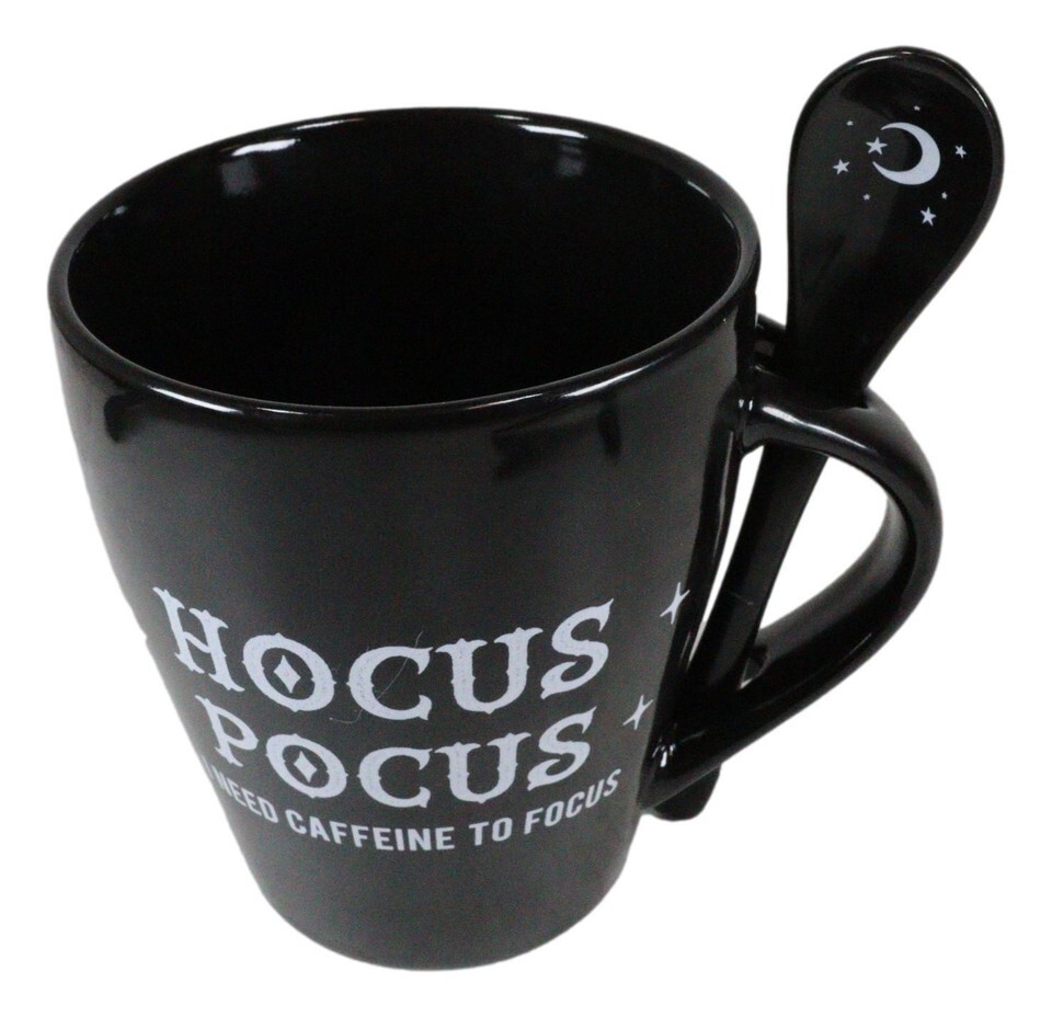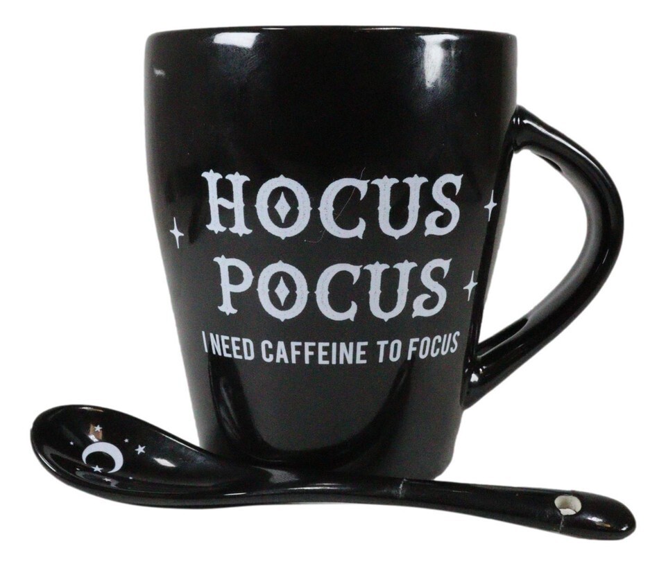 ? This enchanting mug and spoon set will add a touch of magic to any cup of coffee/tea/drink. The mug features the words 'Hocus Pocus I Need Caffeine To Focus' and has a matching teaspoon with a mystical crescent moon design surrounded by stars, which fits perfectly into the built in slotted handle.