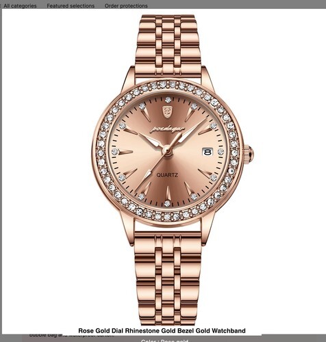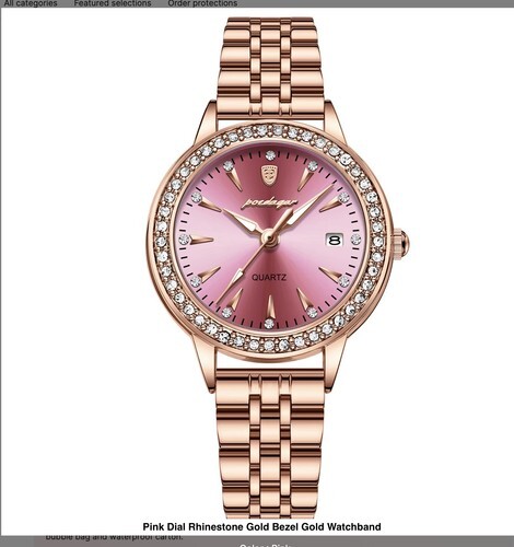 round watch has rhinestone encrusted gold bezel and it comes in a variety of dial face colors to choose from, allowing