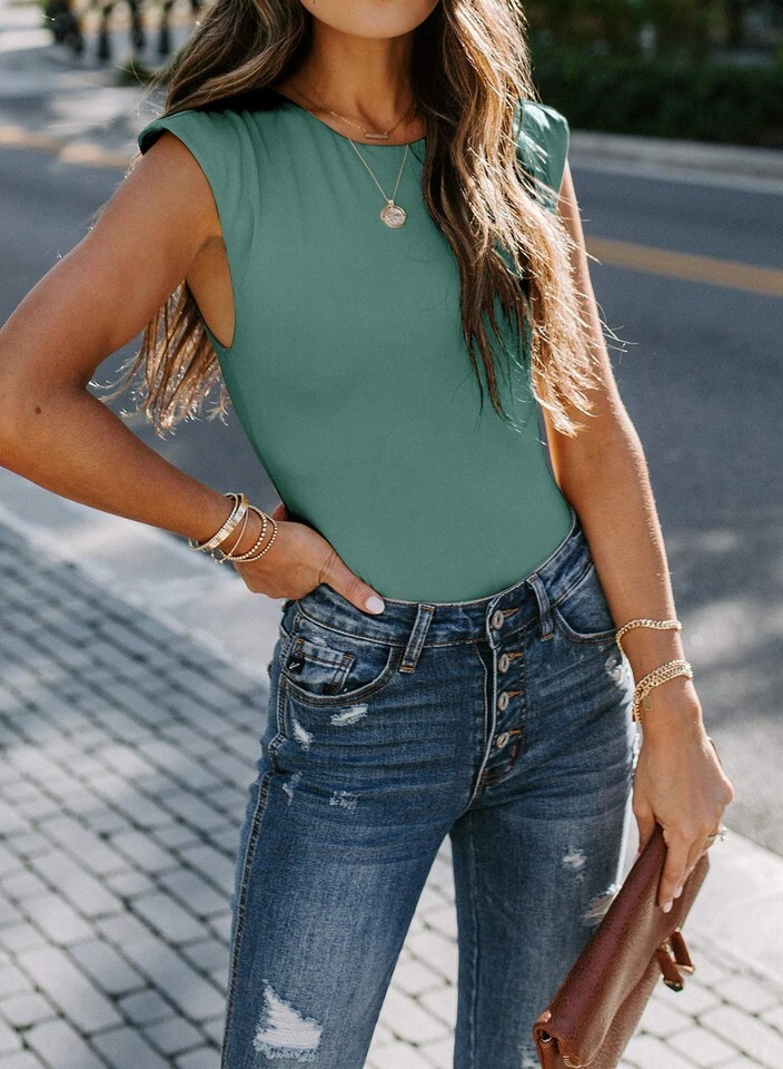Deisgn: Sleeveless knit bodysuit, Sexy One Piece Bodysuits, Solid Bodycon Jumpsuits, Crew Neck Sleeveless Basic Bodysuits Tank Tops with Shoulder Pads. Button down and High elasticity making this bodysuit very easy to wear