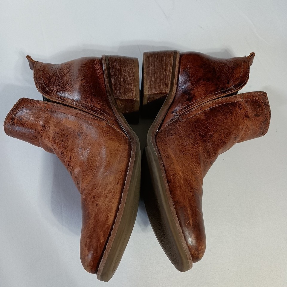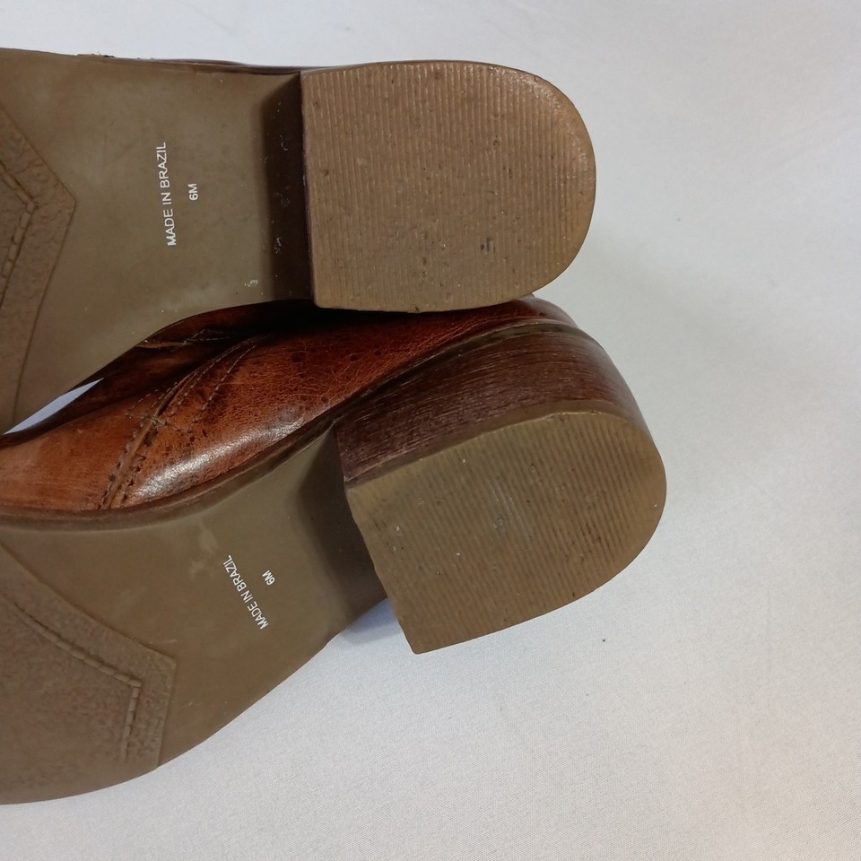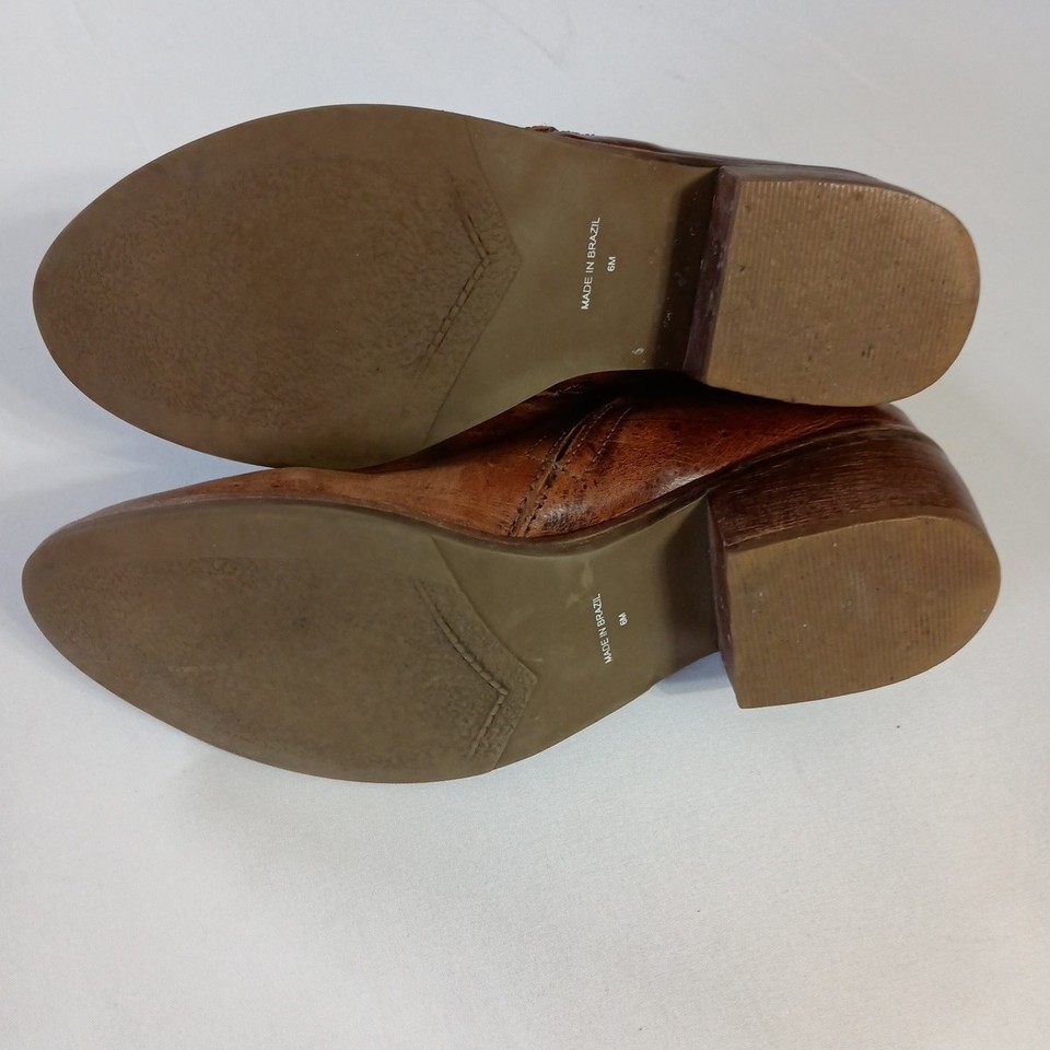The product is a pair of Matisse Brown Leather Like Wilder Western Ankle Boots in size 6M. These pull-on boots feature a low block heel, making them comfortable for casual occasions. The Western theme adds a stylish touch to the booties, while the rubber outsole provides durability. Made with leather and a rubber insole, these ankle boots are a trendy and practical choice for women looking to add a touch of western flair to their outfit. Normal wear.