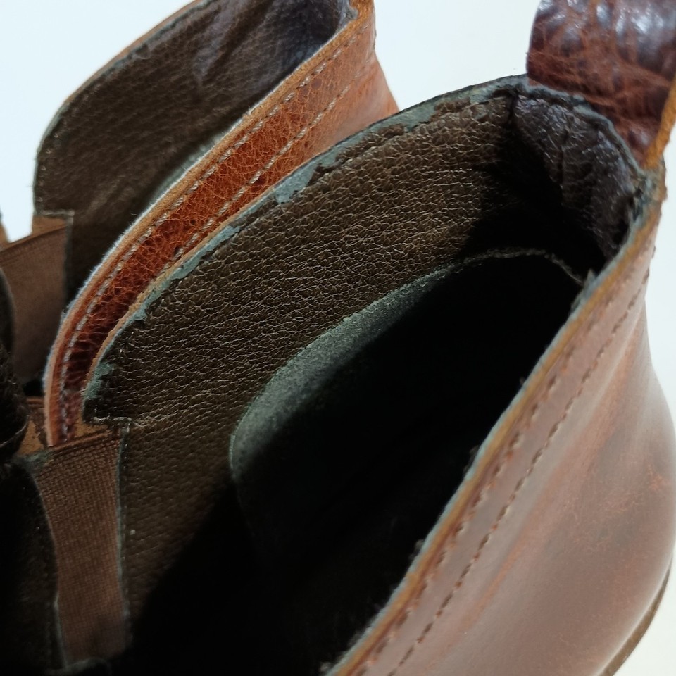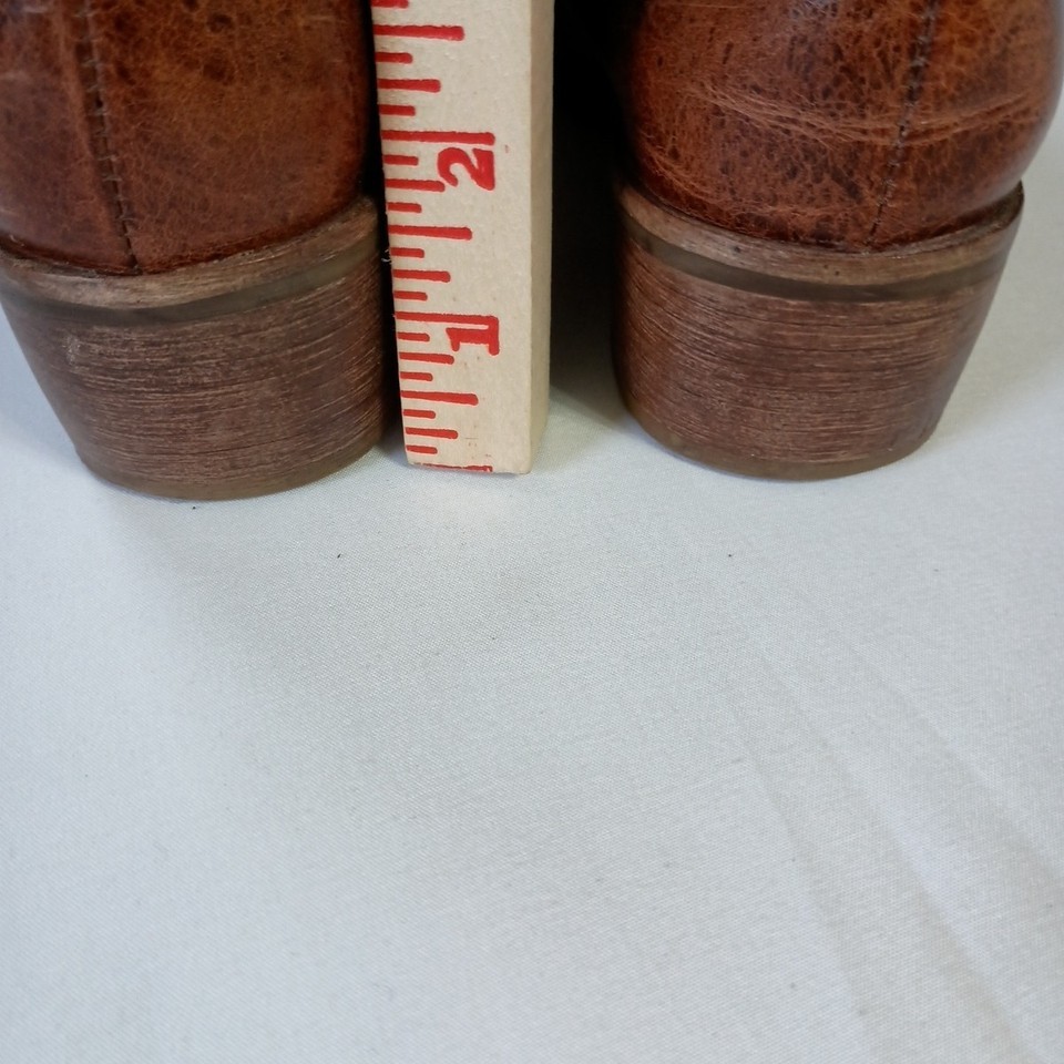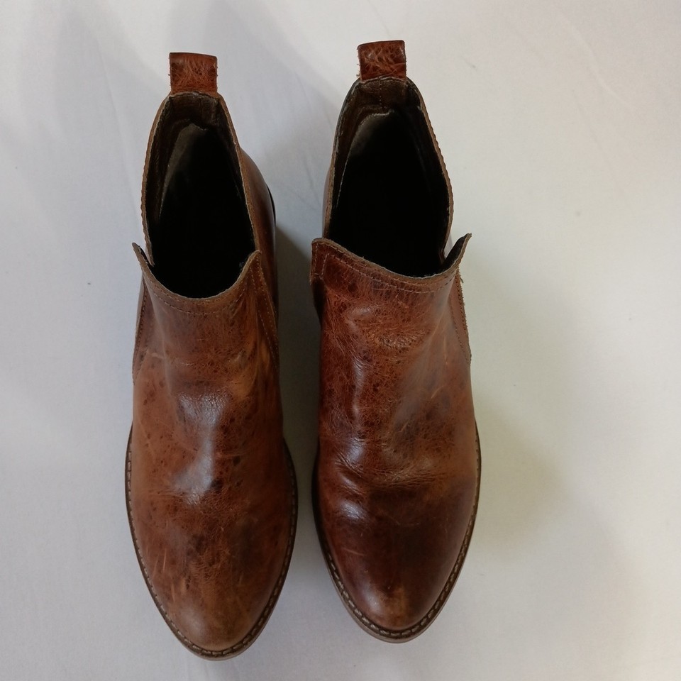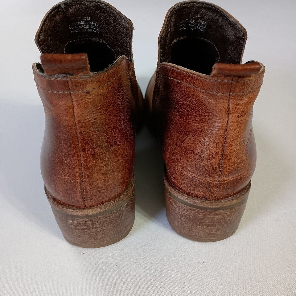 The product is a pair of Matisse Brown Leather Like Wilder Western Ankle Boots in size 6M. These pull-on boots feature a low block heel, making them comfortable for casual occasions. The Western theme adds a stylish touch to the booties, while the rubber outsole provides durability. Made with leather and a rubber insole, these ankle boots are a trendy and practical choice for women looking to add a touch of western flair to their outfit. Normal wear.